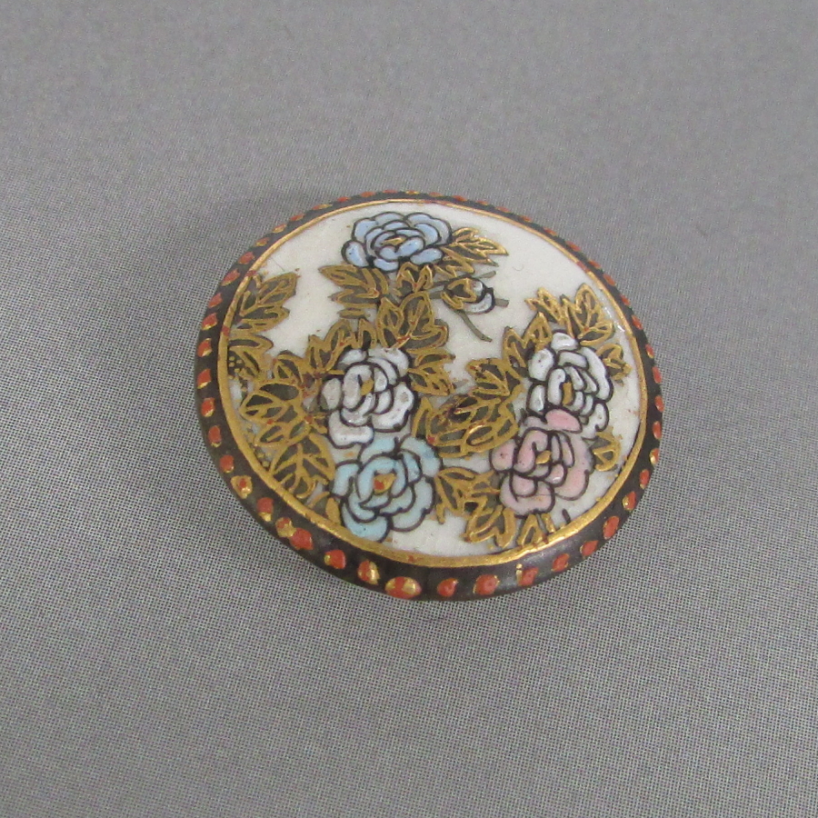 薩摩焼(銘:無銘)が海外向けに作陶した花文ボタンです。薩摩焼は明治時代に欧米で「極東の宝石」と評され、日本の陶磁器の人気に火を付けました。陶磁器を有望な輸出品として認識した政府は、様々な政策を講じて輸出の後押しをした結果、日本各地で作陶され様々な発展を遂げていきました。