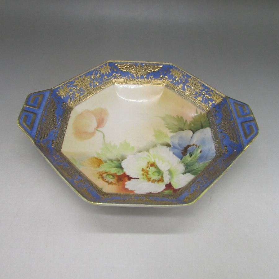 オールドノリタケの金彩花文ボウルです。1911年頃~1921年頃にアメリカに輸出され、約100年の時を経て日本に里帰りしてきました。オールドノリタケは現在のノリタケカンパニーが明治末期から戦前までに製造したアンティーク陶磁器の総称です。豪華絢爛な西洋風絵付け陶磁器は海外で人気を博しました。近年では、約100年という長い歳月を経て日本に里帰りしてきたことで、わが国でも大変人気が高くなっており、美術工芸品として高い地位を確保しつつあります。