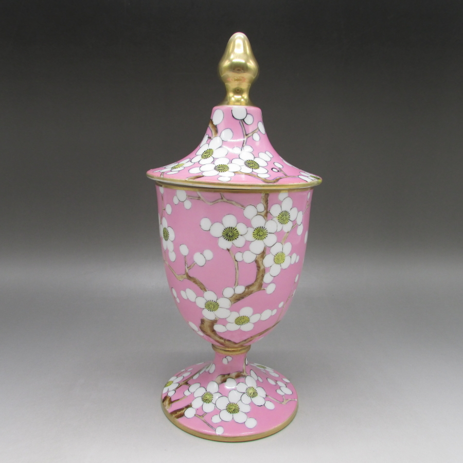 オールドノリタケの白花文飾壺です。1921年頃~1941年頃にアメリカに輸出され、約100年の時を経て日本に里帰りしてきました。オールドノリタケは現在のノリタケカンパニーが明治末期から戦前までに製造したアンティーク陶磁器の総称です。豪華絢爛な西洋風絵付け陶磁器は海外で人気を博しました。近年では、約100年という長い歳月を経て日本に里帰りしてきたことで、わが国でも大変人気が高くなっており、美術工芸品として高い地位を確保しつつあります。
