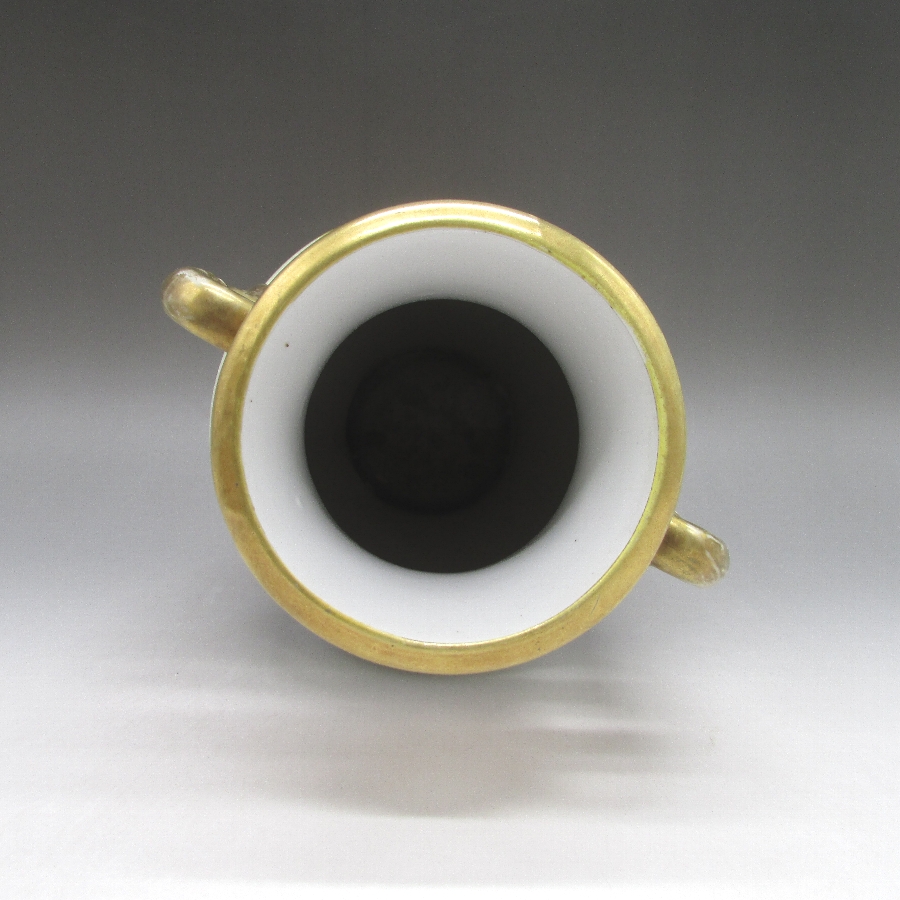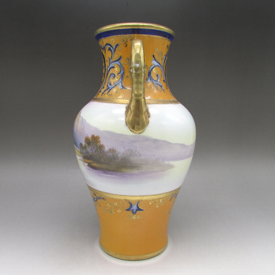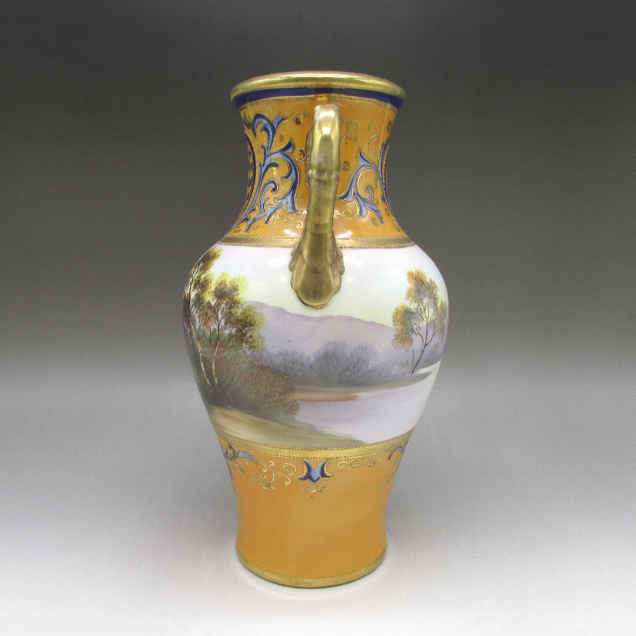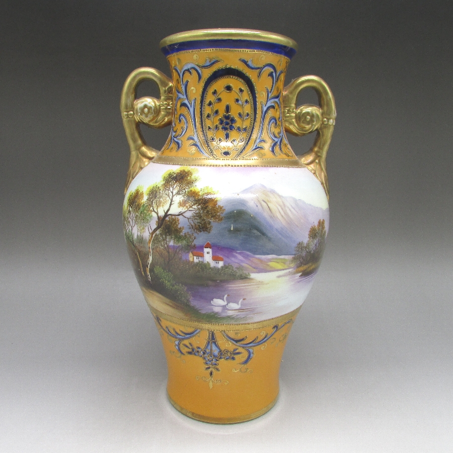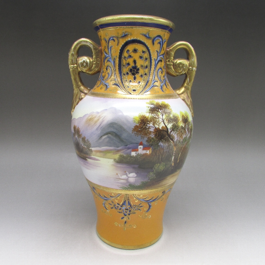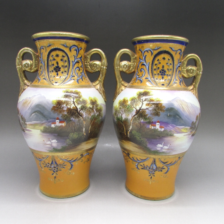 オールドノリタケの風景文花瓶一対です。1906年頃~1925年頃にイギリスに輸出され、約100年の時を経て日本に里帰りしてきました。山麓湖畔に家と白鳥を花瓶周りに描き、その上部と下部を他の装飾デザインで仕上げた豪華な作品です。