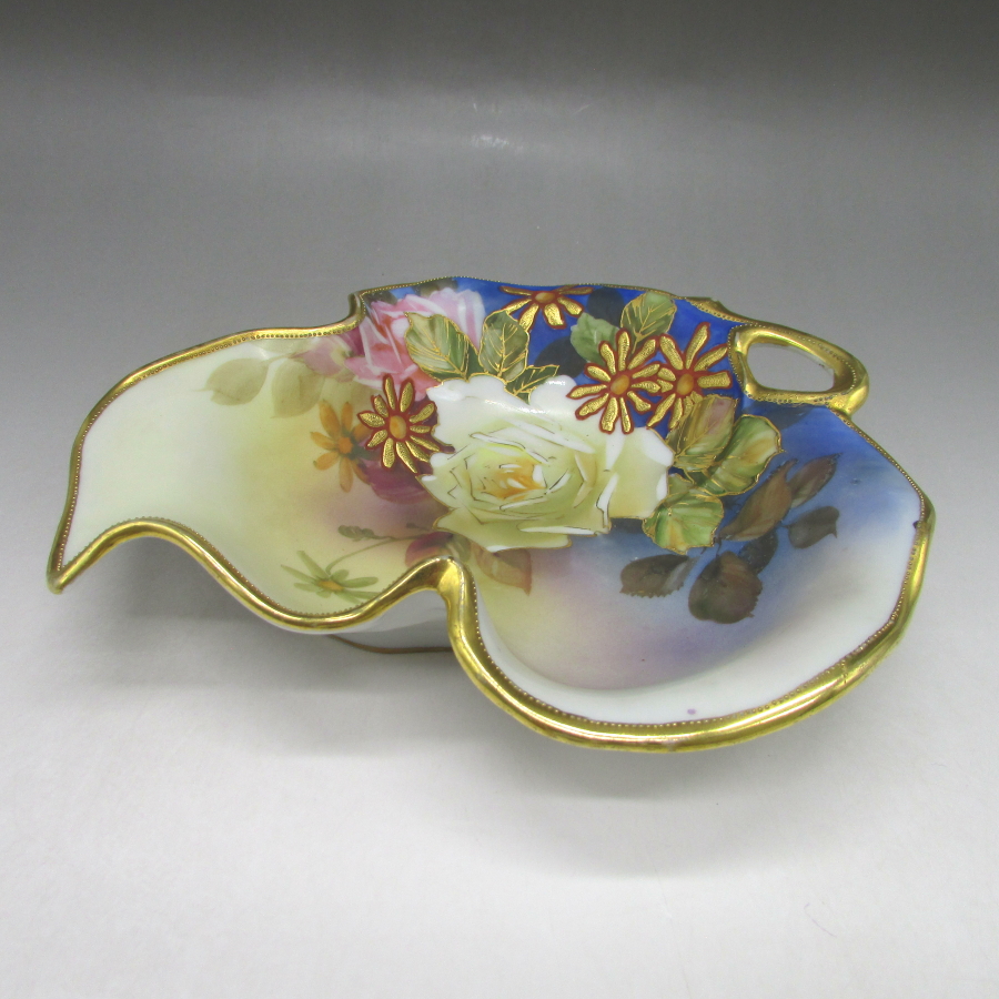オールドノリタケの花文ボウルです。1911年頃~1921年頃にアメリカに輸出され、約100年の時を経て日本に里帰りしてきました。オールドノリタケは現在のノリタケカンパニーが明治末期から戦前までに製造したアンティーク陶磁器の総称です。豪華絢爛な西洋風絵付け陶磁器は海外で人気を博しました。近年では、約100年という長い歳月を経て日本に里帰りしてきたことで、わが国でも大変人気が高くなっており、美術工芸品として高い地位を確保しつつあります。