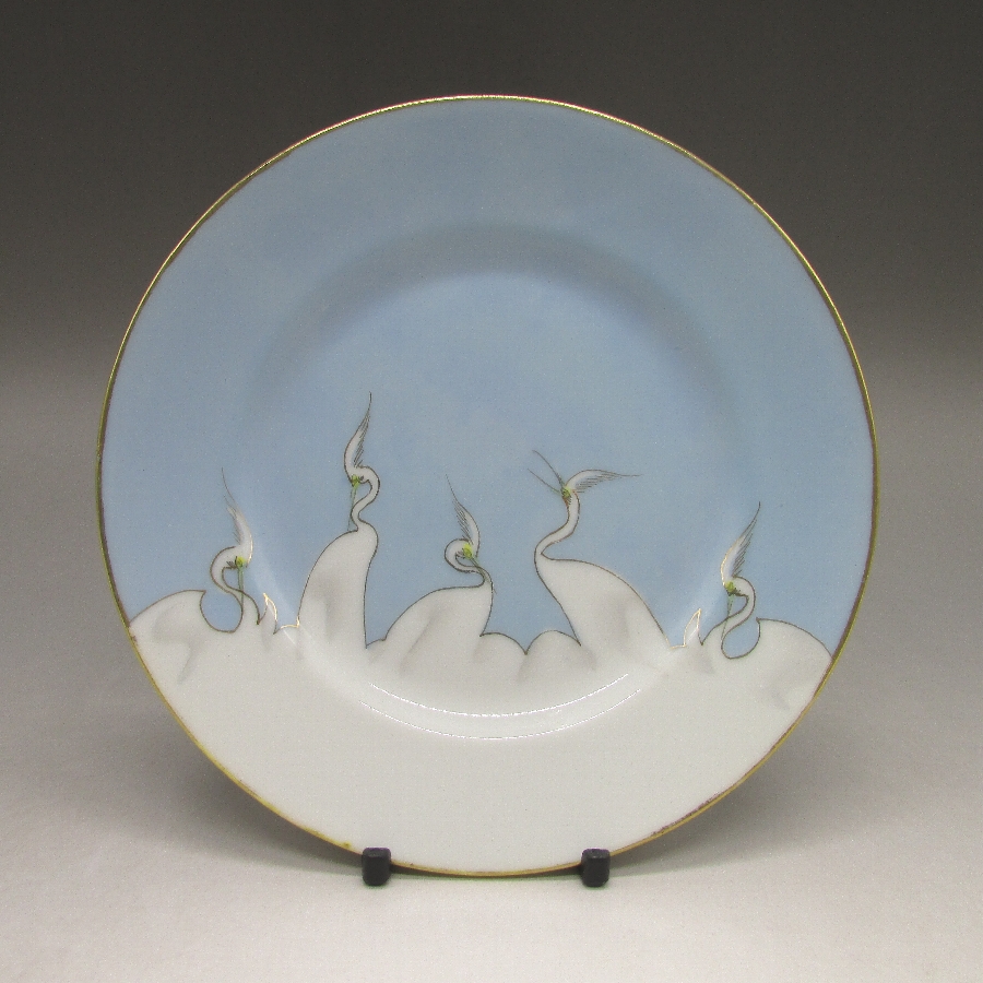 志水禄之助が主に欧米諸国向けに作陶した鳥文皿です。志水禄之助とは優れた絵付技術で会社再建をした名画工です。明治30年代~40年代初期の問屋です。初めは、瀧籐商店に勤めていたが、1892年頃にヴァンタイン商会が名古屋に出張所を設けたのをきっかけに、当時の貿易物の輸出不況とあいまって、瀧籐商店を辞め、西瓦町に志水禄之助商店を設立しました。特に瀧籐商店時代の1883年頃に倒産の危機に直面した会社を再建した優れた絵付け技術を持つ名画工です。裏印はイニシャルR.Sと日の出を組み合わせたものがあり、1940年頃までは操業していたようです。