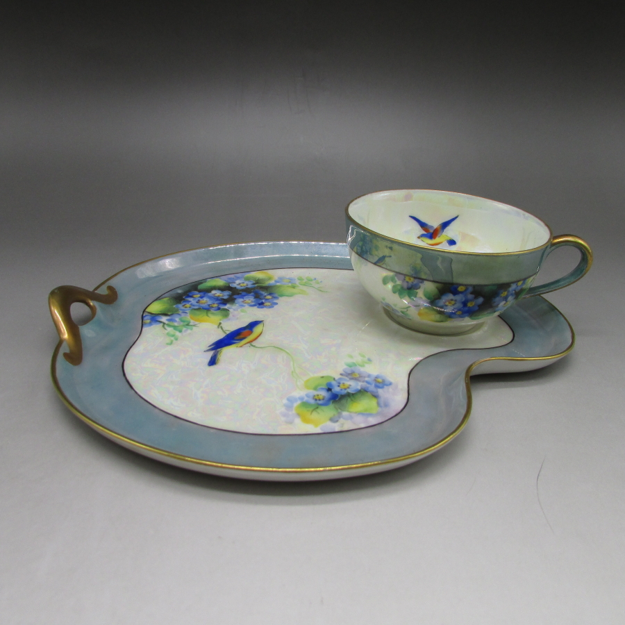 オールドノリタケの鳥文スナックセットです。1921年頃~1941年頃にアメリカに輸出され、約100年の時を経て日本に里帰りしてきました。オールドノリタケは現在のノリタケカンパニーが明治末期から戦前までに製造したアンティーク陶磁器の総称です。豪華絢爛な西洋風絵付け陶磁器は海外で人気を博しました。近年では、約100年という長い歳月を経て日本に里帰りしてきたことで、わが国でも大変人気が高くなっており、美術工芸品として高い地位を確保しつつあります。