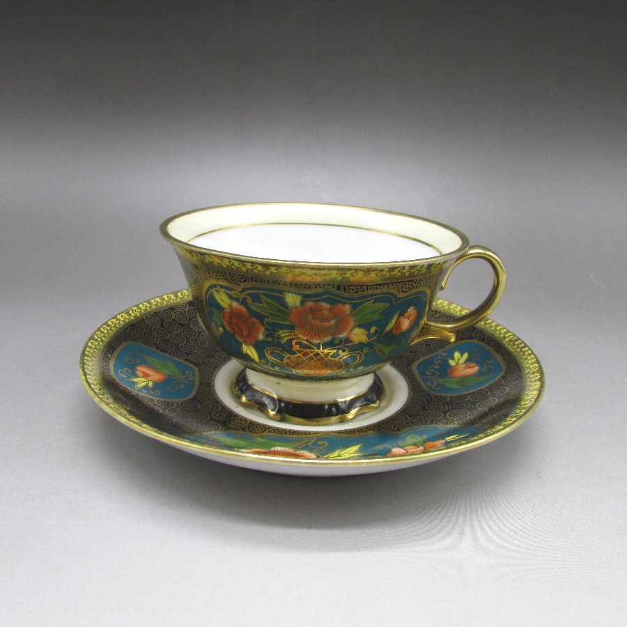 オールドノリタケの花文カップ&ソーサーです。1906年頃~1925年頃にイギリスに輸出され、約100年の時を経て日本に里帰りしてきました。オールドノリタケは現在のノリタケカンパニーが明治末期から戦前までに製造したアンティーク陶磁器の総称です。豪華絢爛な西洋風絵付け陶磁器は海外で人気を博しました。近年では、約100年という長い歳月を経て日本に里帰りしてきたことで、わが国でも大変人気が高くなっており、美術工芸品として高い地位を確保しつつあります。
