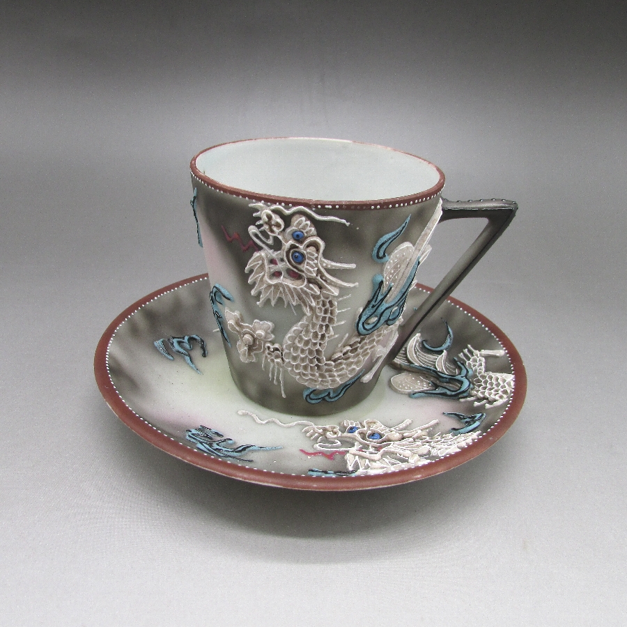 瀧藤商店が主に欧米諸国向けに作陶した龍盛上カップ&ソーサーです。瀧藤商店とは愛知県の農家に生まれた「瀧籐萬次郎」が1874年に名古屋に設立した会社で、海外向けの洋食器の絵付加工をおこなっていました。1857年に名古屋の宇佐見陶器店に入社したが、いったん飯田重兵衛らの招きで東京のソーシャル商会設立のため上京するが名古屋に戻り、1874年に独立しました。1884年頃から志水録之助という優秀な絵付け指導者を得たことで事業を順調に拡大させていきました。当時ヴァンタイン商会、アイザック等の横浜にある外国商館や井村彦次郎等が重要な顧客だったようです。1893年にはシカゴ万博に名古屋の代表として参加しています。1899年には治三郎が後を継ぎました。ニューヨーク、シカゴ、シアトル等に支店を開設し盛業でした。