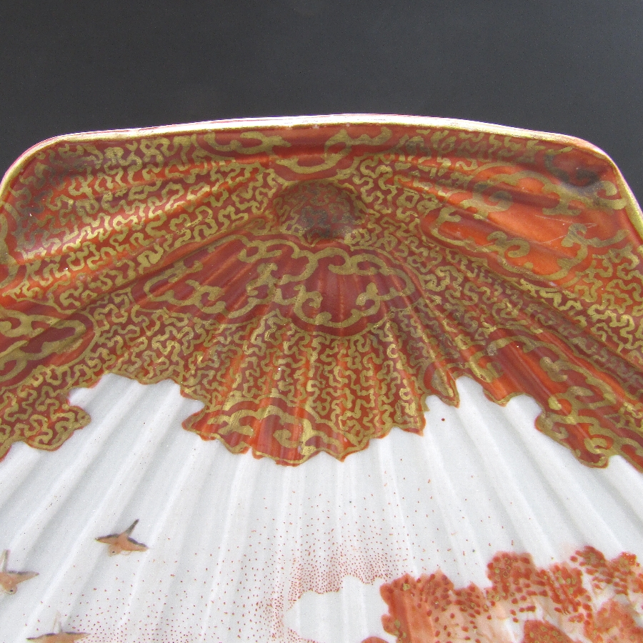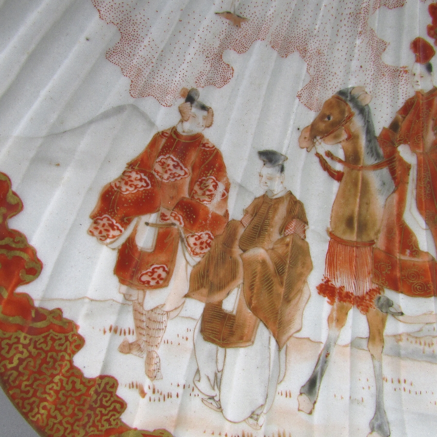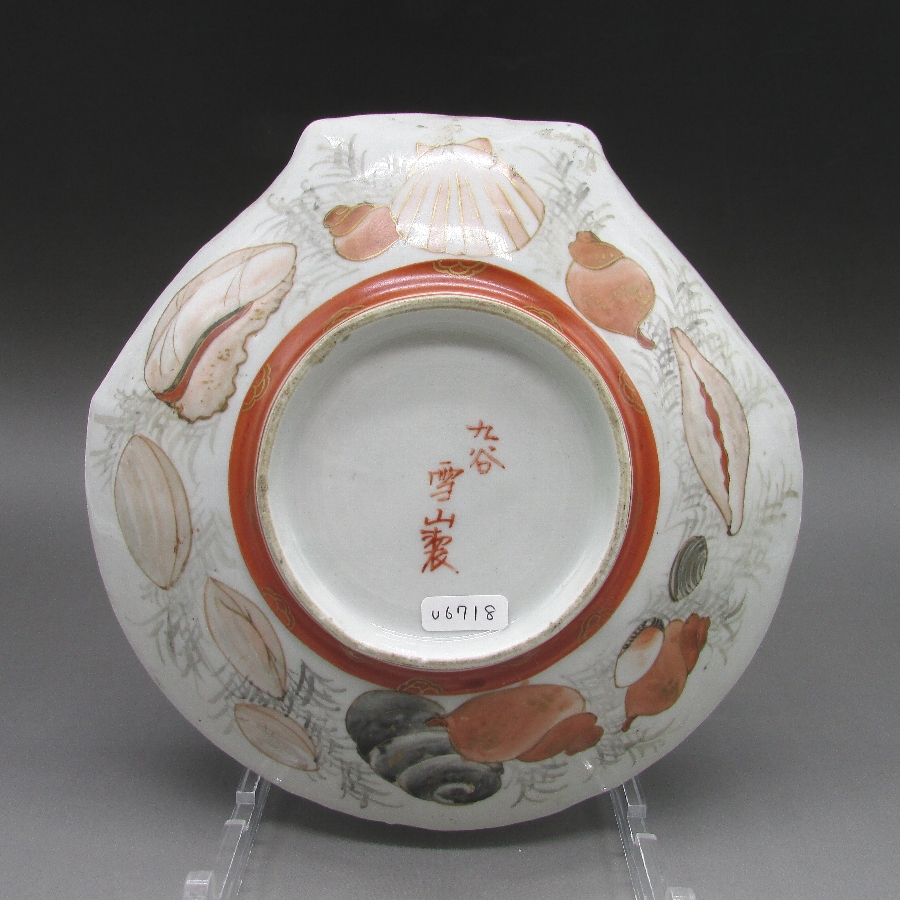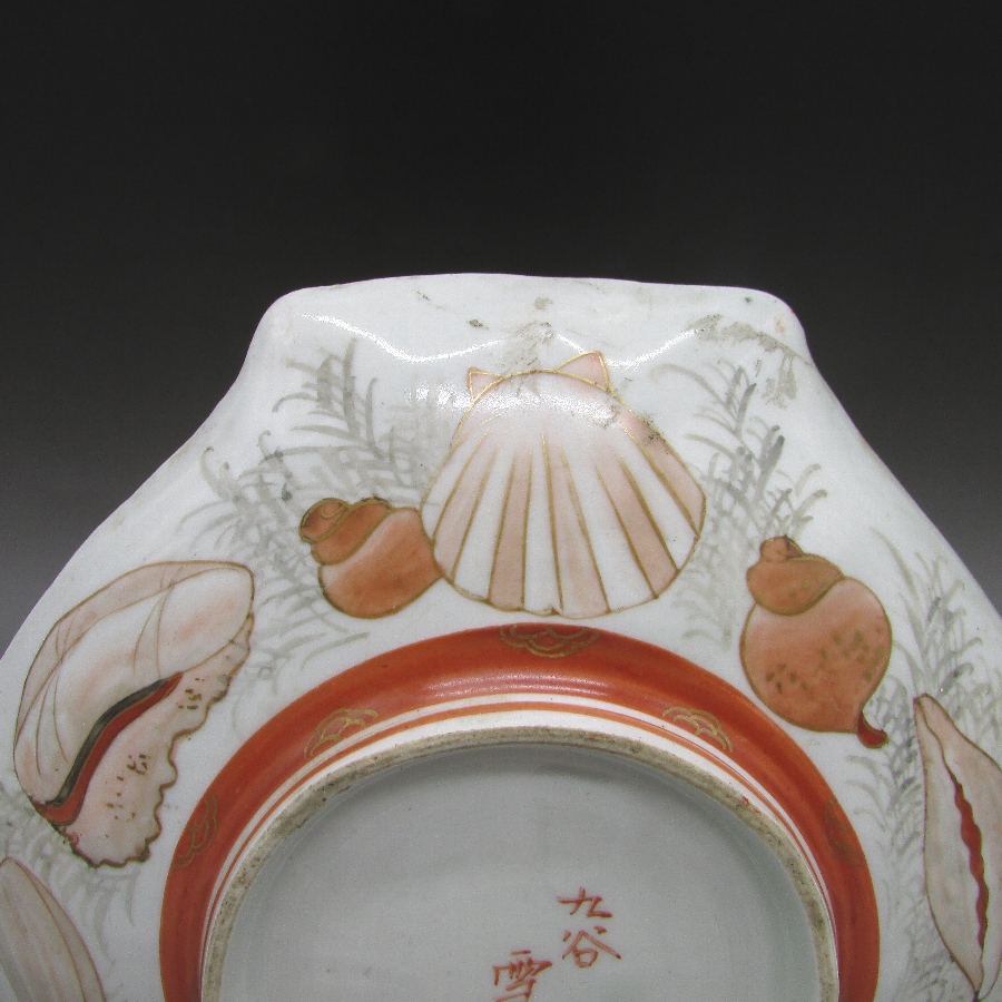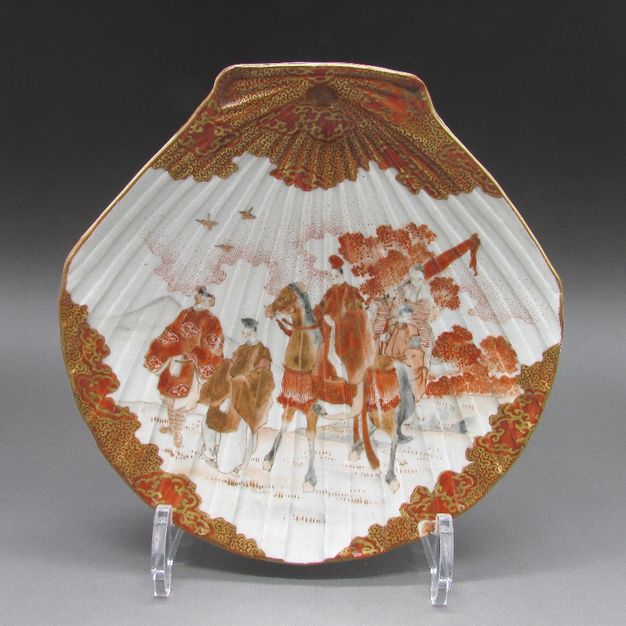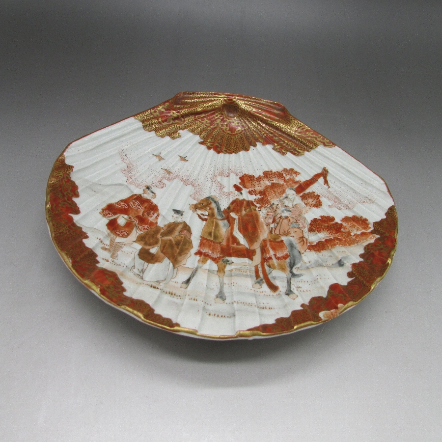 九谷焼の人物風俗文貝型皿です。九谷焼は日本の伝統的美意識や技法を引き継いだやきもの になります。