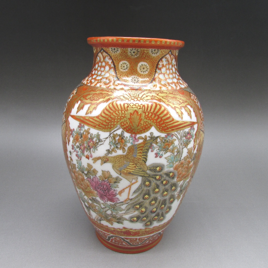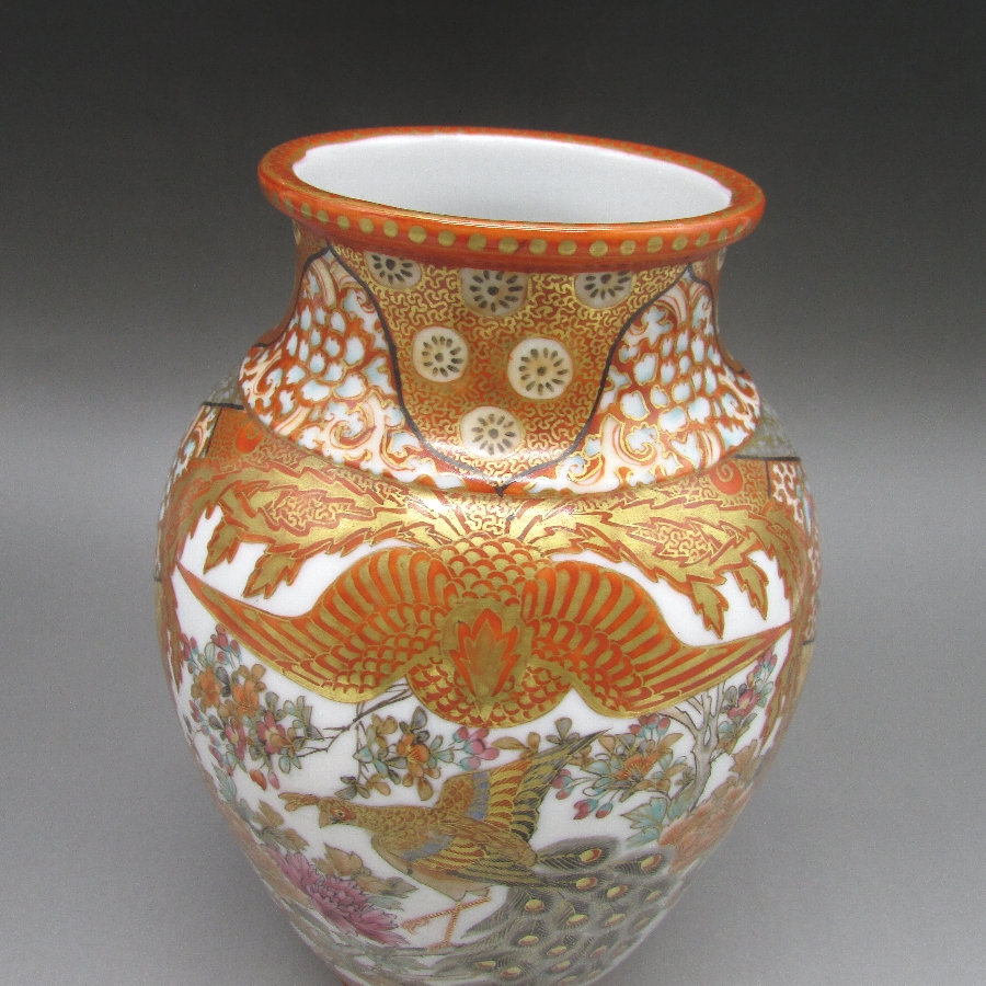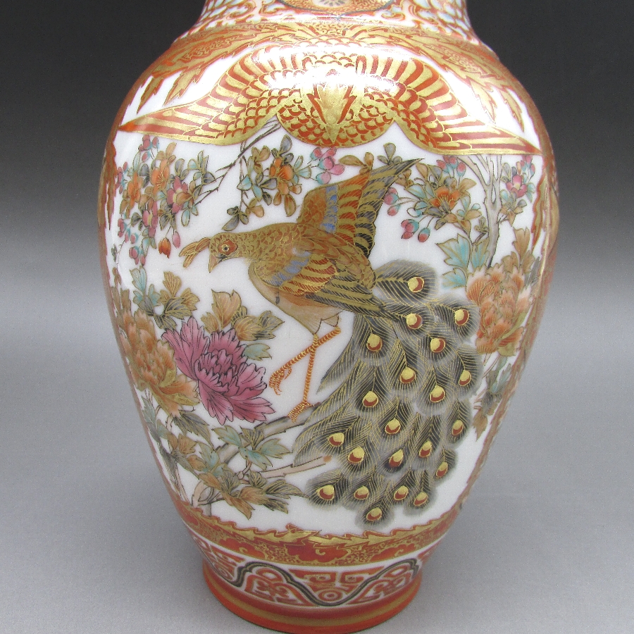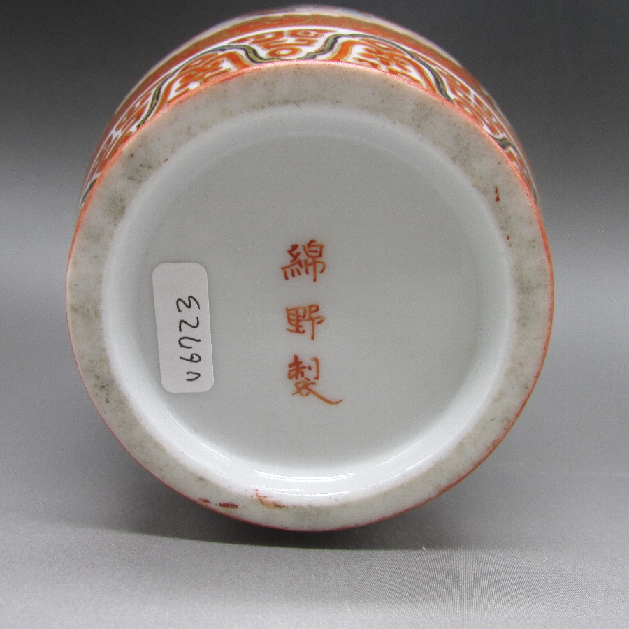 九谷焼・綿野が主に欧米諸国向けに作陶した花鳥文花瓶です。九谷焼は日本の伝統的美意識や技法を引き継いだやきもの になります。綿野家はもともと木綿商でしたが、父・源右衛門は九谷焼の輸出を志し、1873年のウィーン万博に出品、1879年のフィラデルフィア万博にも出品しました。綿野吉二( 1859 - 1934年 )は1877年、父の跡を継ぎ、1879年にはパリに九谷焼の直輸出を試み販路拡張に努めました。また、京浜地区の同業仲間とともに日本貿易協会を設立し、1882年には陶商同盟の頭取となりました。粗製乱造の商品が現れはじめた1882年、綿野吉二らの努力で業界の問題に対処する体制を作りました。そして輸出見本の製作、上絵の徒弟試験の導入などが実施されたことから、画風が刷新され、輸出が一段と伸びました。