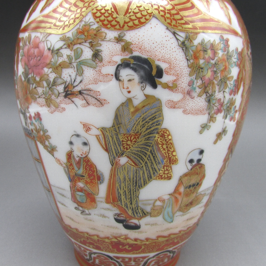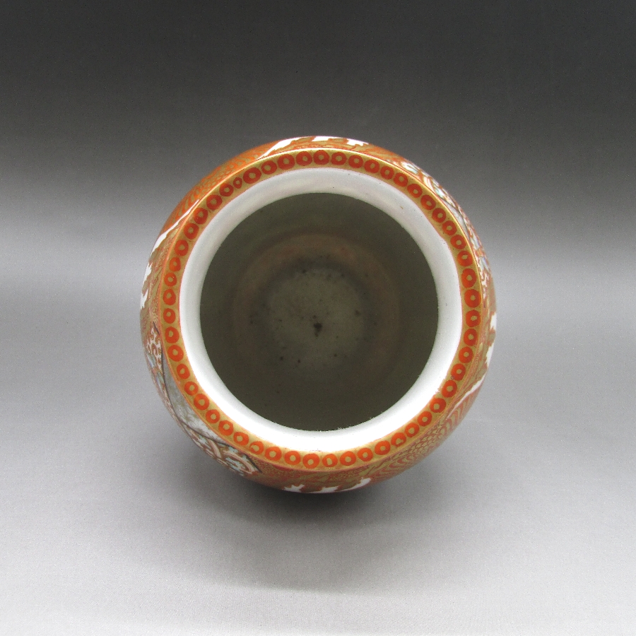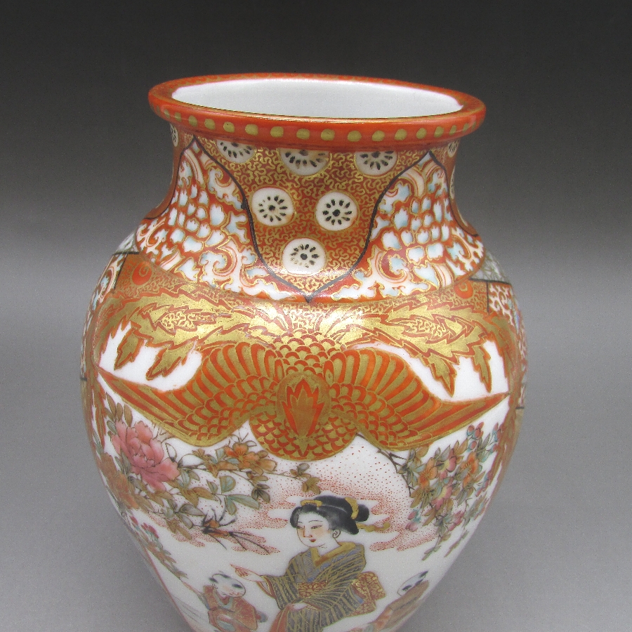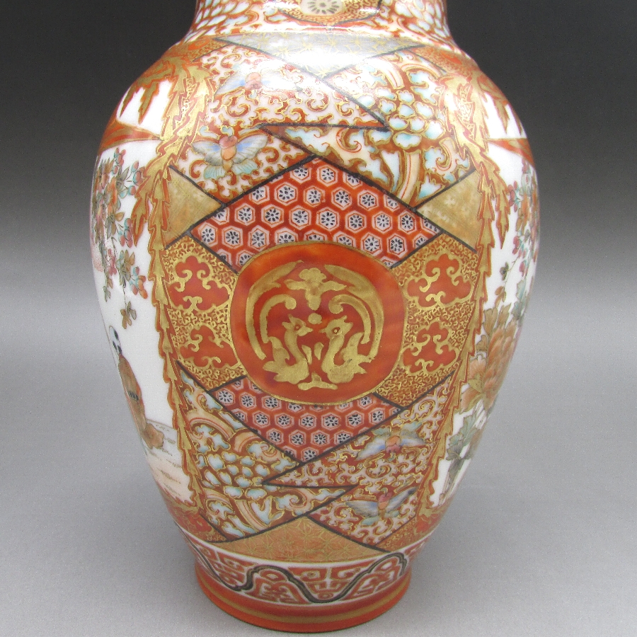 九谷焼・綿野が主に欧米諸国向けに作陶した花鳥文花瓶です。九谷焼は日本の伝統的美意識や技法を引き継いだやきもの になります。綿野家はもともと木綿商でしたが、父・源右衛門は九谷焼の輸出を志し、1873年のウィーン万博に出品、1879年のフィラデルフィア万博にも出品しました。綿野吉二( 1859 - 1934年 )は1877年、父の跡を継ぎ、1879年にはパリに九谷焼の直輸出を試み販路拡張に努めました。また、京浜地区の同業仲間とともに日本貿易協会を設立し、1882年には陶商同盟の頭取となりました。粗製乱造の商品が現れはじめた1882年、綿野吉二らの努力で業界の問題に対処する体制を作りました。そして輸出見本の製作、上絵の徒弟試験の導入などが実施されたことから、画風が刷新され、輸出が一段と伸びました。