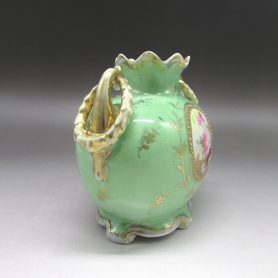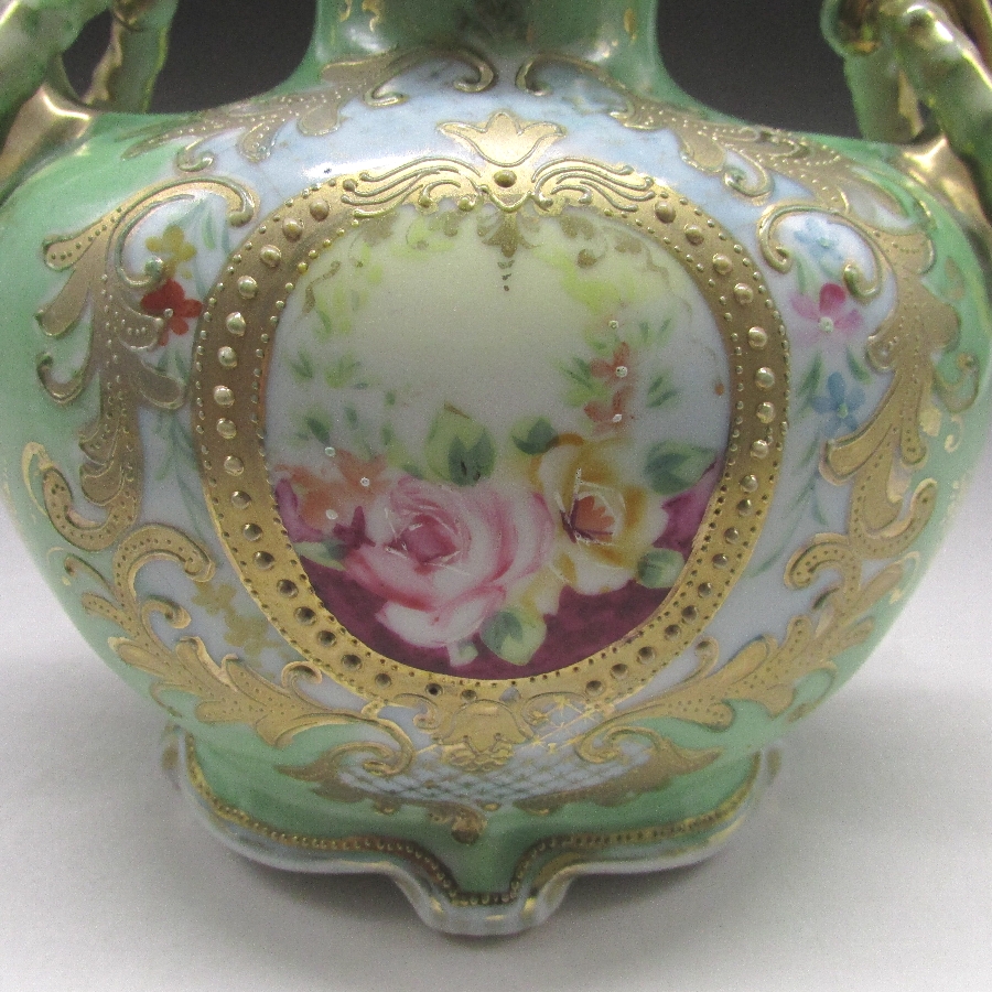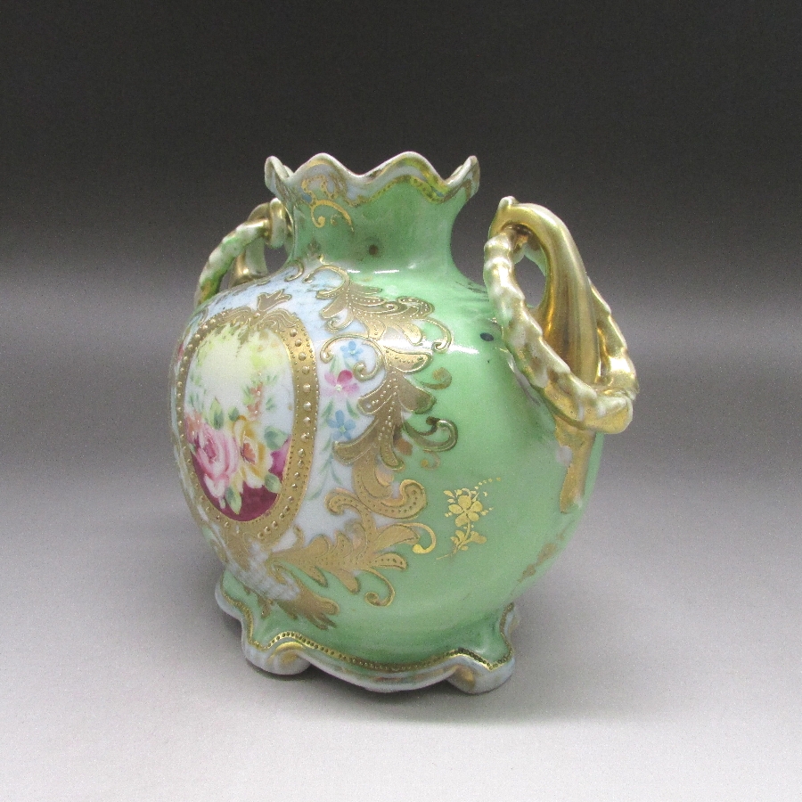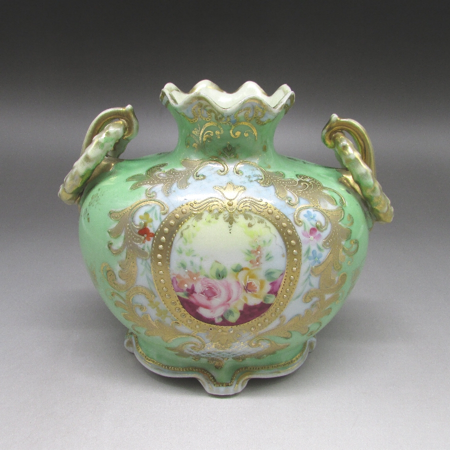 オールドノリタケの花文把手付花瓶です。1900年頃~1910年頃にイギリスに輸出され、約100年の時を経て日本に里帰りしてきました。アール・ヌーヴォ時代の影響を受けた薔薇を描き、ハンドルにプレッツェル型にした素晴らしい作品です。輸出陶磁器におけるデザインでは、花が最も多く、中でも薔薇が一番人気でした。薔薇は中世以来に日本の美術工芸で好まれたモティーフであった為に、絵付け職人にも馴染みがあり描きやすかったと思います。