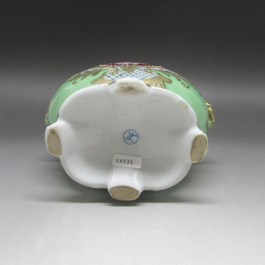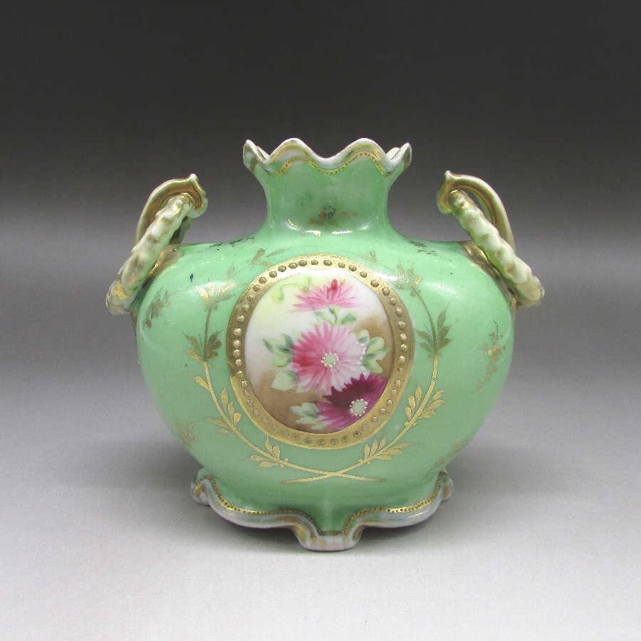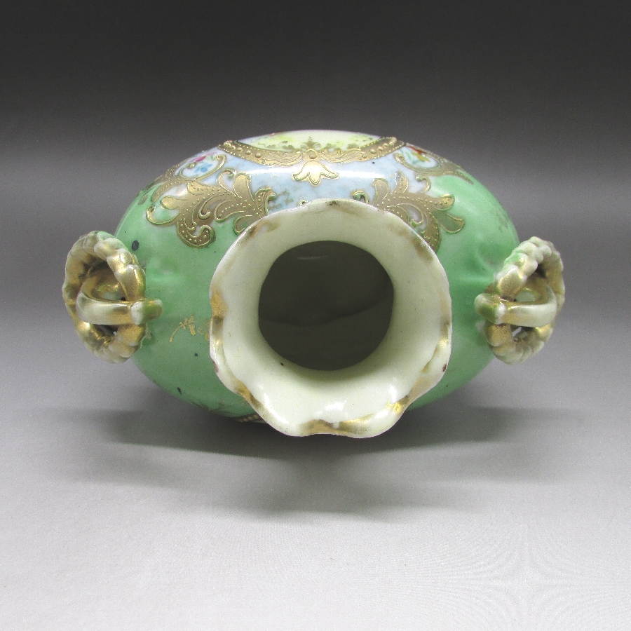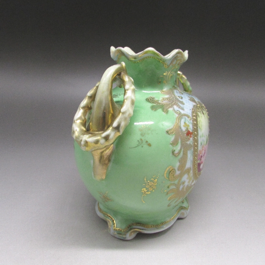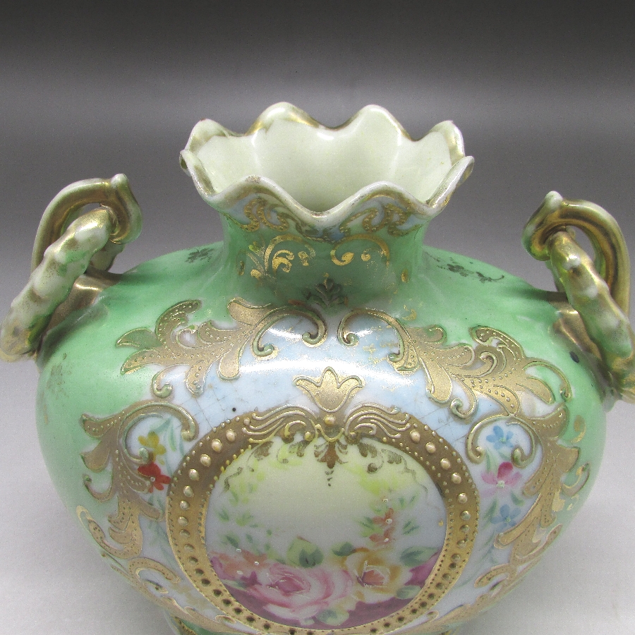オールドノリタケの花文把手付花瓶です。1900年頃~1910年頃にイギリスに輸出され、約100年の時を経て日本に里帰りしてきました。アール・ヌーヴォ時代の影響を受けた薔薇を描き、ハンドルにプレッツェル型にした素晴らしい作品です。輸出陶磁器におけるデザインでは、花が最も多く、中でも薔薇が一番人気でした。薔薇は中世以来に日本の美術工芸で好まれたモティーフであった為に、絵付け職人にも馴染みがあり描きやすかったと思います。
