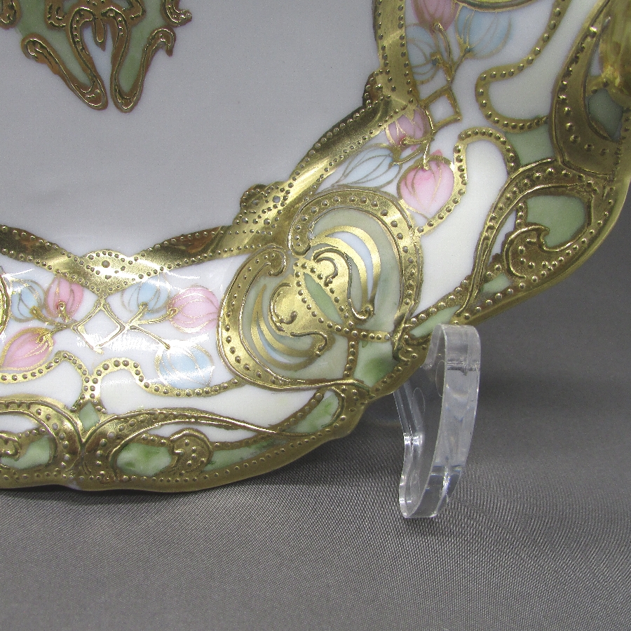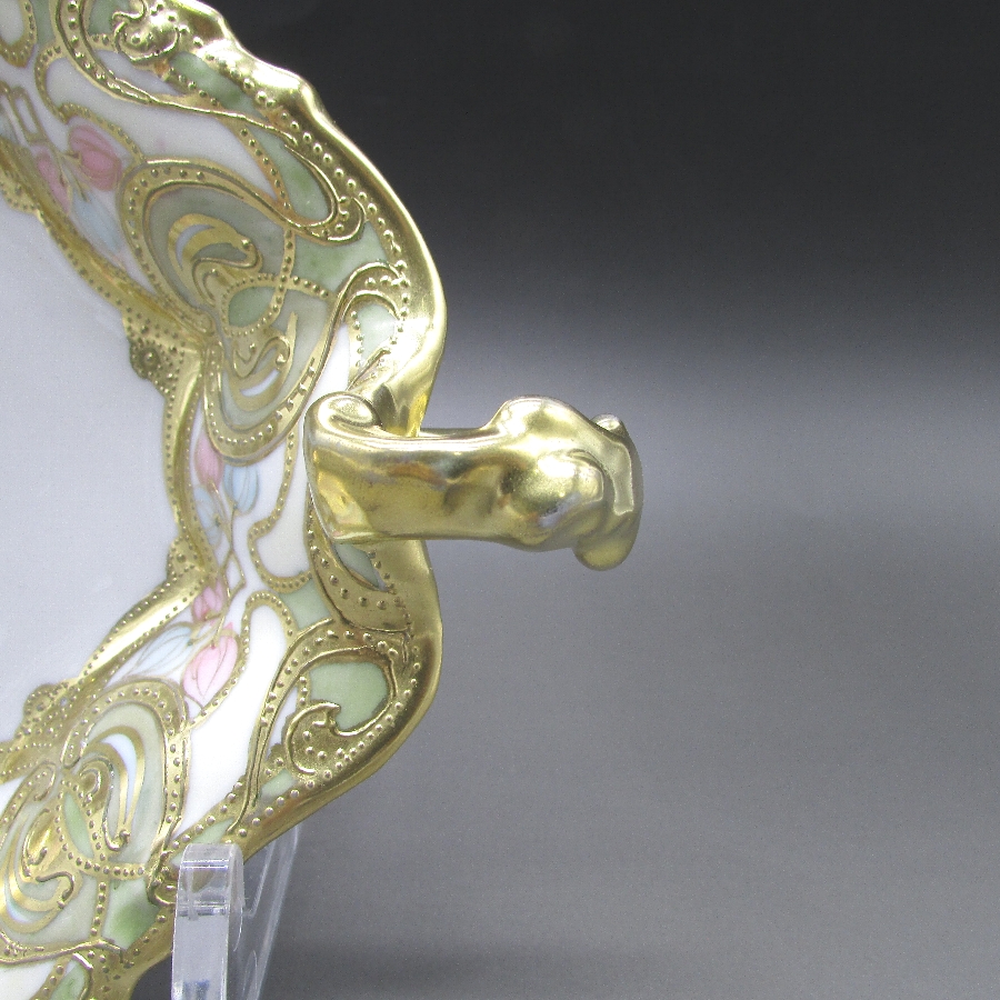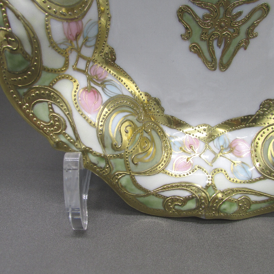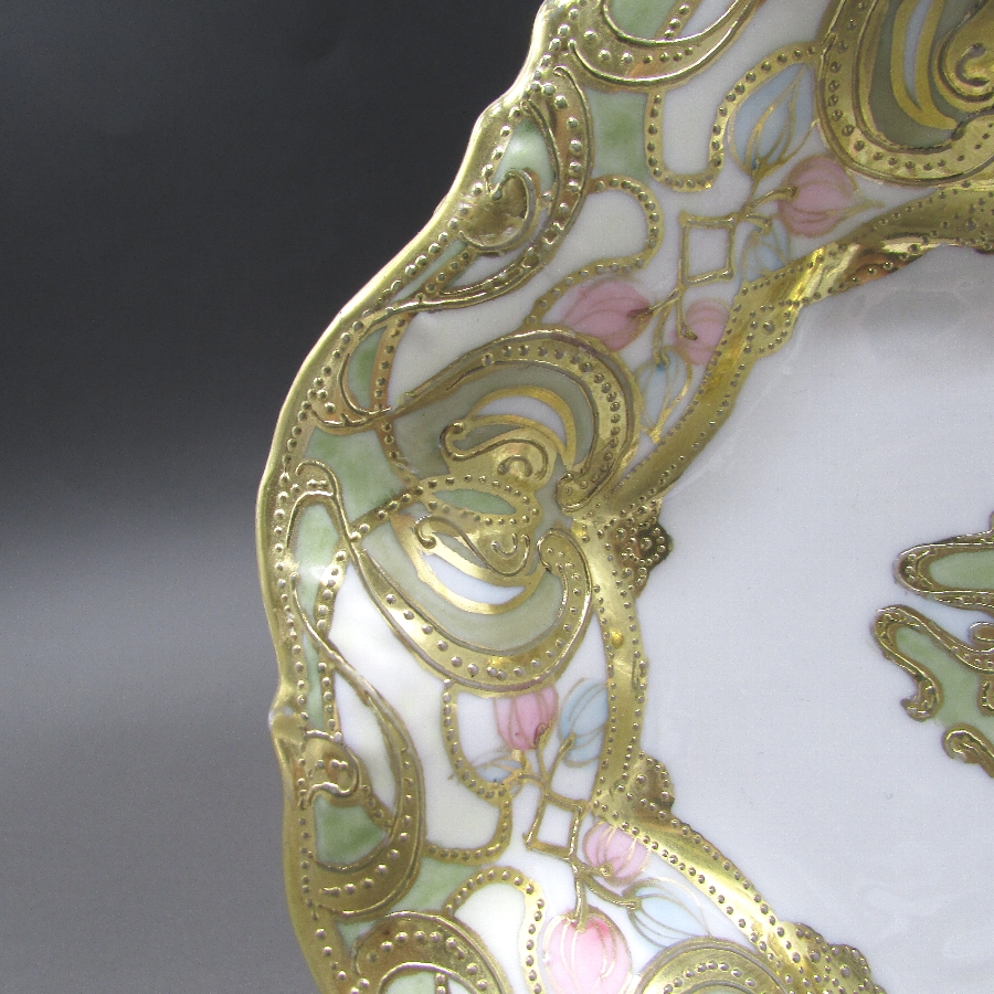 オールドノリタケの金盛り花文ボウルです。1906年頃~1921年頃にアメリカに輸出され、約100年の時を経て日本に里帰りしてきました。アール・ヌーヴォ時代の影響を受けた花を描いた素晴らしい作品です。また、金盛り装飾は高級品の代表的な装飾技法で、点、点線、線などを泥漿で描き、焼成した後に金液を筆などで塗り被せて仕上げる技法です。欧米で人気のあった豪華絢爛な仕上がりにするのに最適な技法です。オールドノリタケでよく用いられている金液は金の延棒を濃塩酸と濃硝酸を体積比で3対1に混ぜた溶液で溶解し液状にしたものを使用していました。