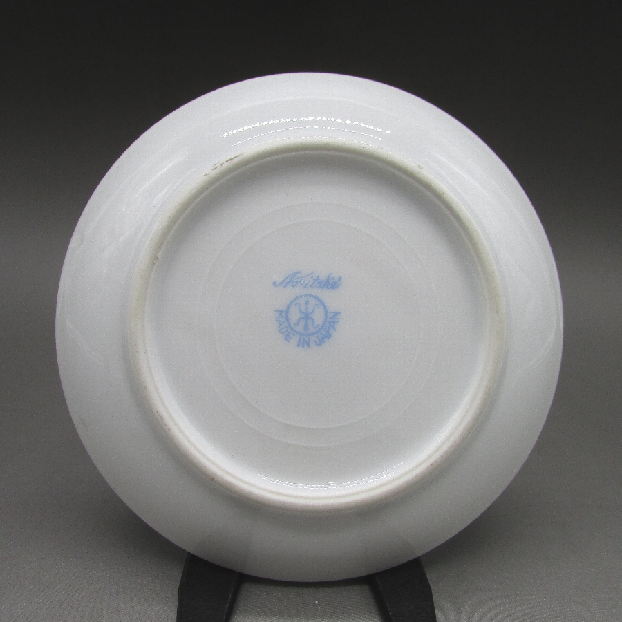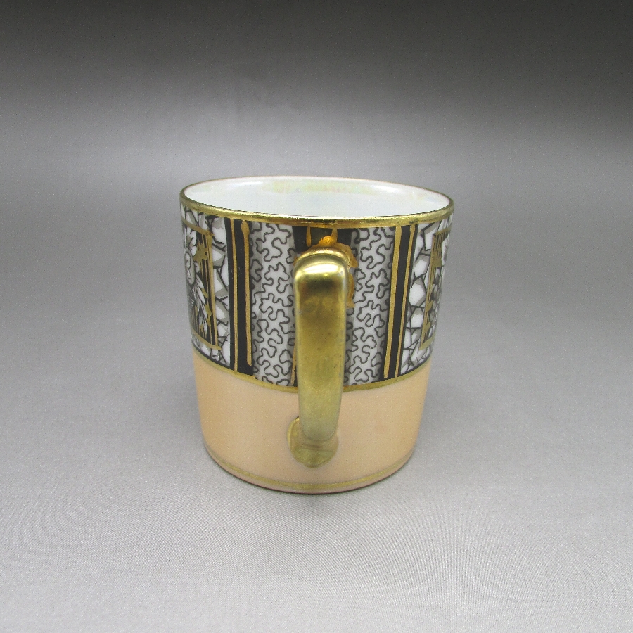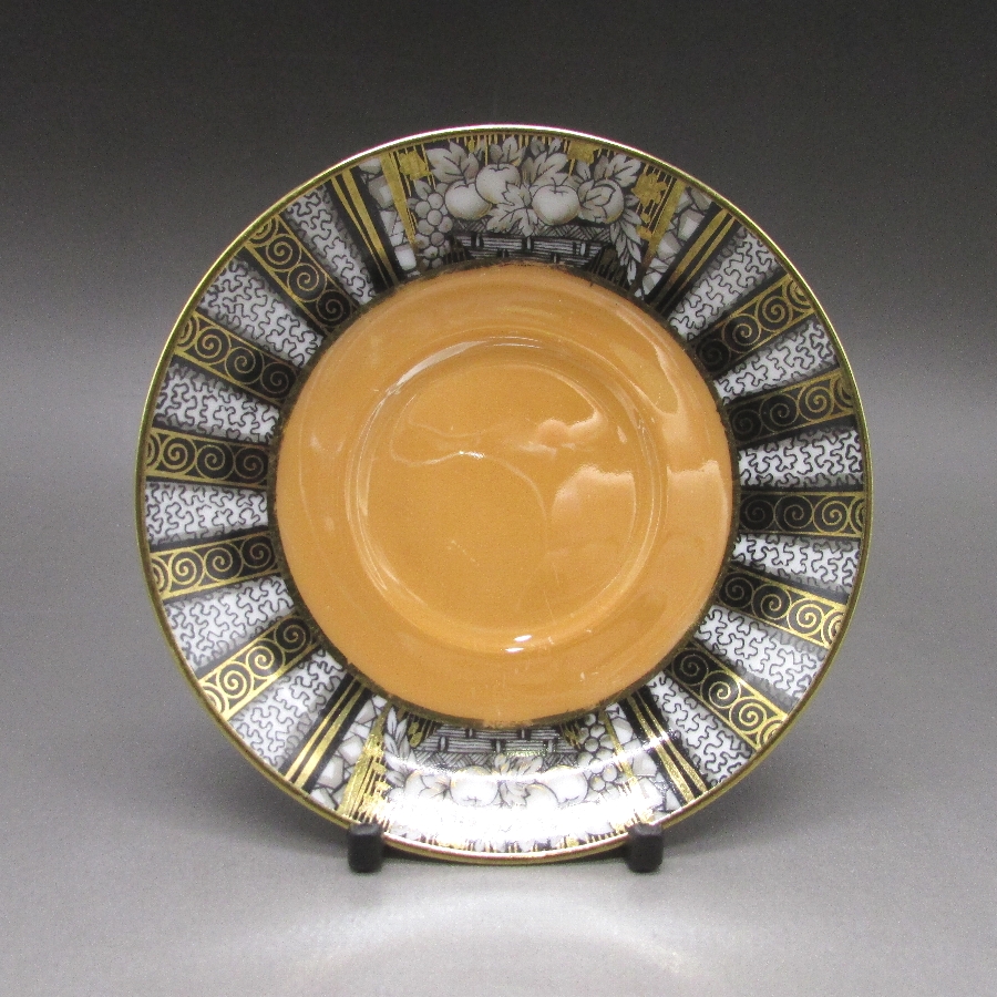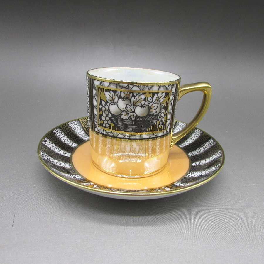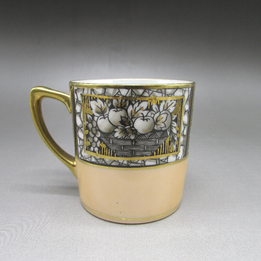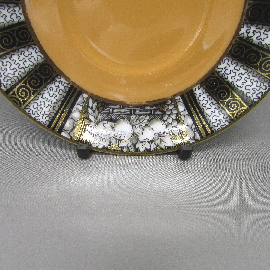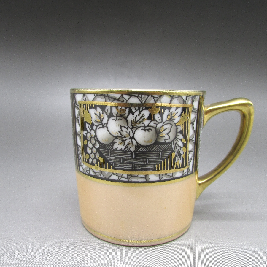オールドノリタケのアールデコ果物文カップ&ソーサーです。1906年頃~1925年頃にイギリスに輸出され、約100年の時を経て日本に里帰りしてきました。黒系と白系のストライプ文様に果物を描き、ラスター彩を用いて煌びやかな雰囲気に仕上げたアールデコ期の作品です。アールデコは1925年にフランスのパリで開催された現代装飾産業美術国際博覧会によって呼ばれるようになった装飾様式です。東洋美術などの芸術的要素を取り入れた直線と立体のシンプルかつ合理的な機能美あるデザインで、明るく・鮮やかな色彩が特徴的です。ノリタケのアール・デコのデザインは1919年に英国人デザイナーの「シリル・シー」が入社してから本格的に始まりました。ノリタケ・アール・デコの制作は1920年頃から1929年の世界恐慌までのわずか10年間程度の制作期間しかなく、未だにその全貌は明らかにされていません。