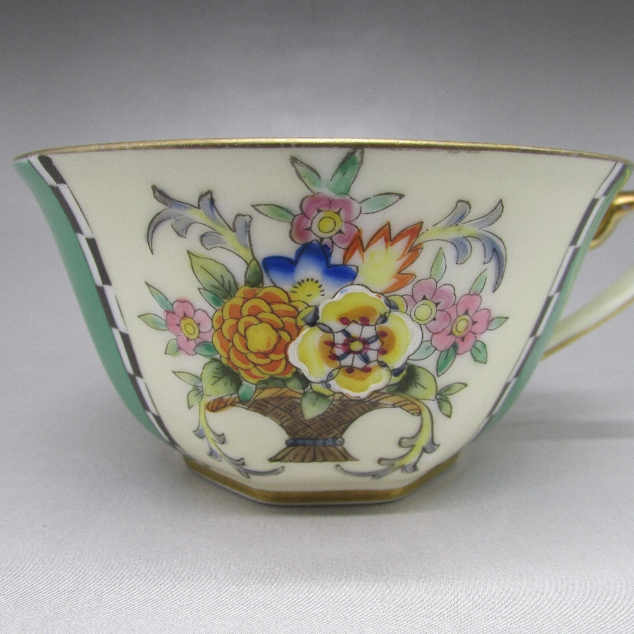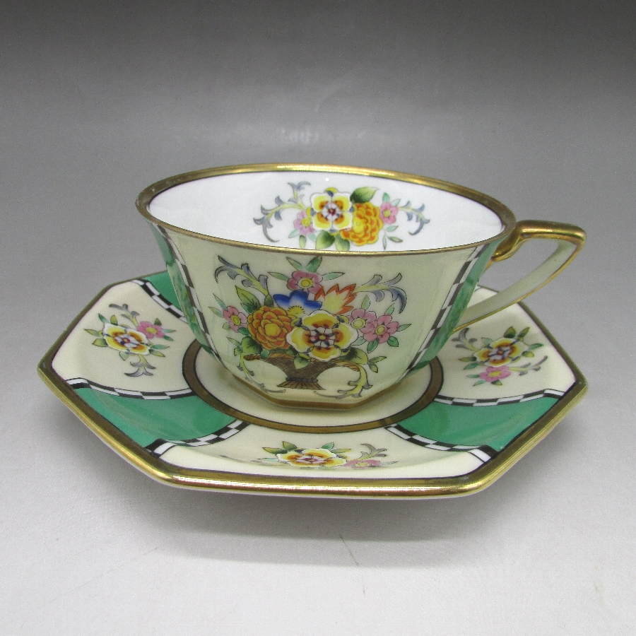 オールドノリタケの花文カップ&ソーサーです。1921年頃~1941年頃にアメリカに輸出され、約100年の時を経て日本に里帰りしてきました。オールドノリタケは現在のノリタケカンパニーが明治末期から戦前までに製造したアンティーク陶磁器の総称です。豪華絢爛な西洋風絵付け陶磁器は海外で人気を博しました。近年では、約100年という長い歳月を経て日本に里帰りしてきたことで、わが国でも大変人気が高くなっており、美術工芸品として高い地位を確保しつつあります。
