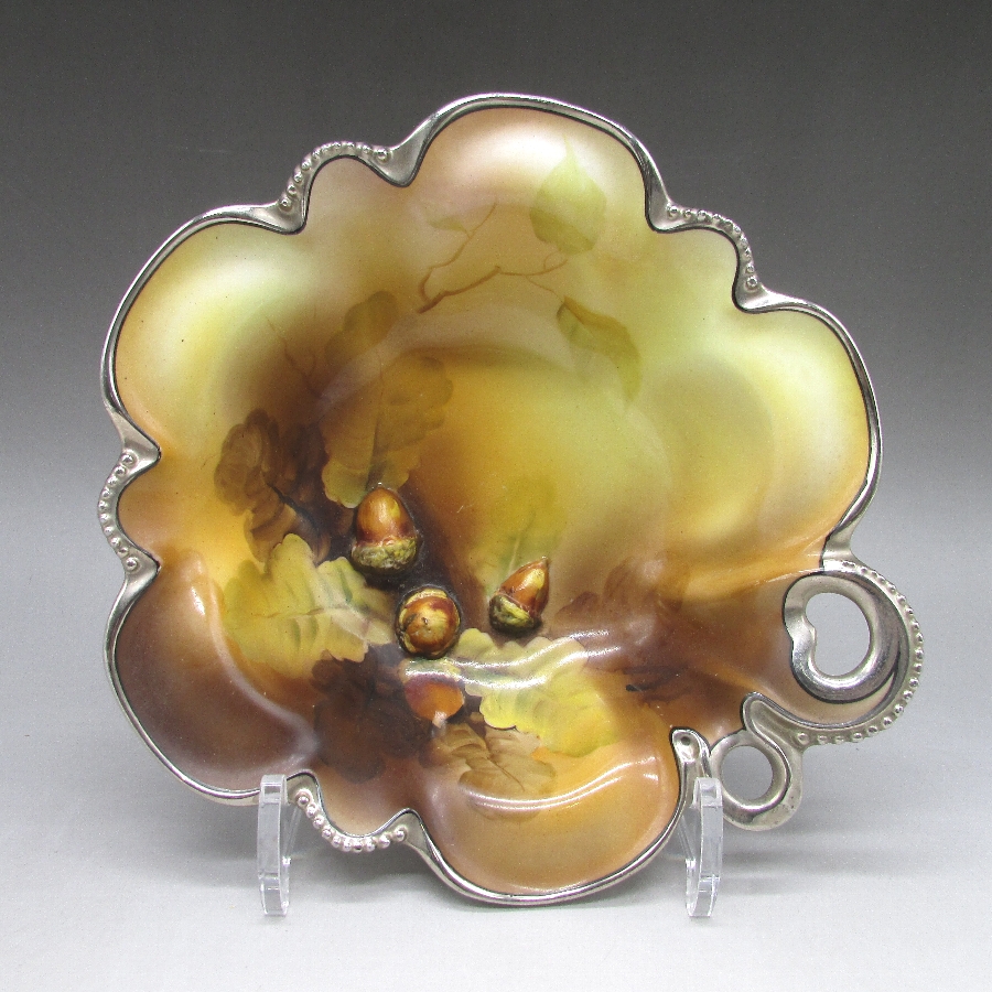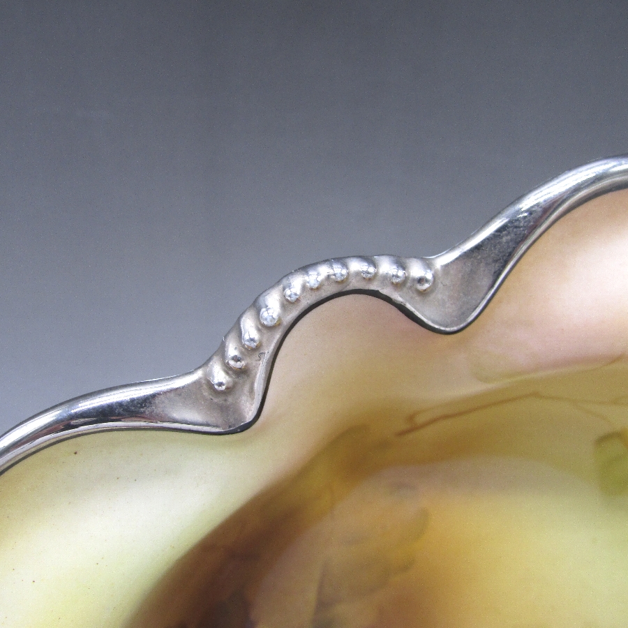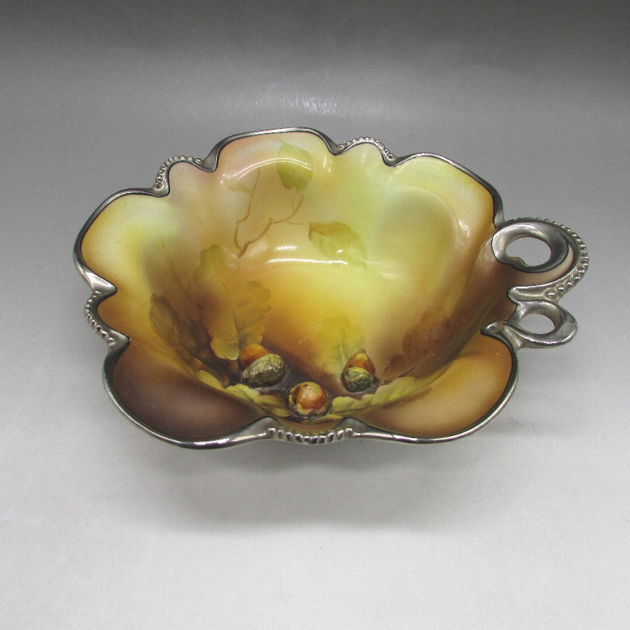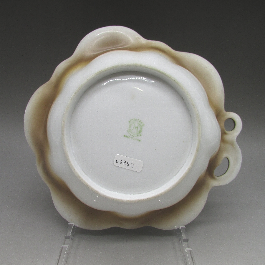 オールドノリタケのナッツ文ボウルです。1921年頃~1941年頃にアメリカに輸出され、約100年の時を経て日本に里帰りしてきました。オールドノリタケは現在のノリタケカンパニーが明治末期から戦前までに製造したアンティーク陶磁器の総称です。豪華絢爛な西洋風絵付け陶磁器は海外で人気を博しました。近年では、約100年という長い歳月を経て日本に里帰りしてきたことで、わが国でも大変人気が高くなっており、美術工芸品として高い地位を確保しつつあります。