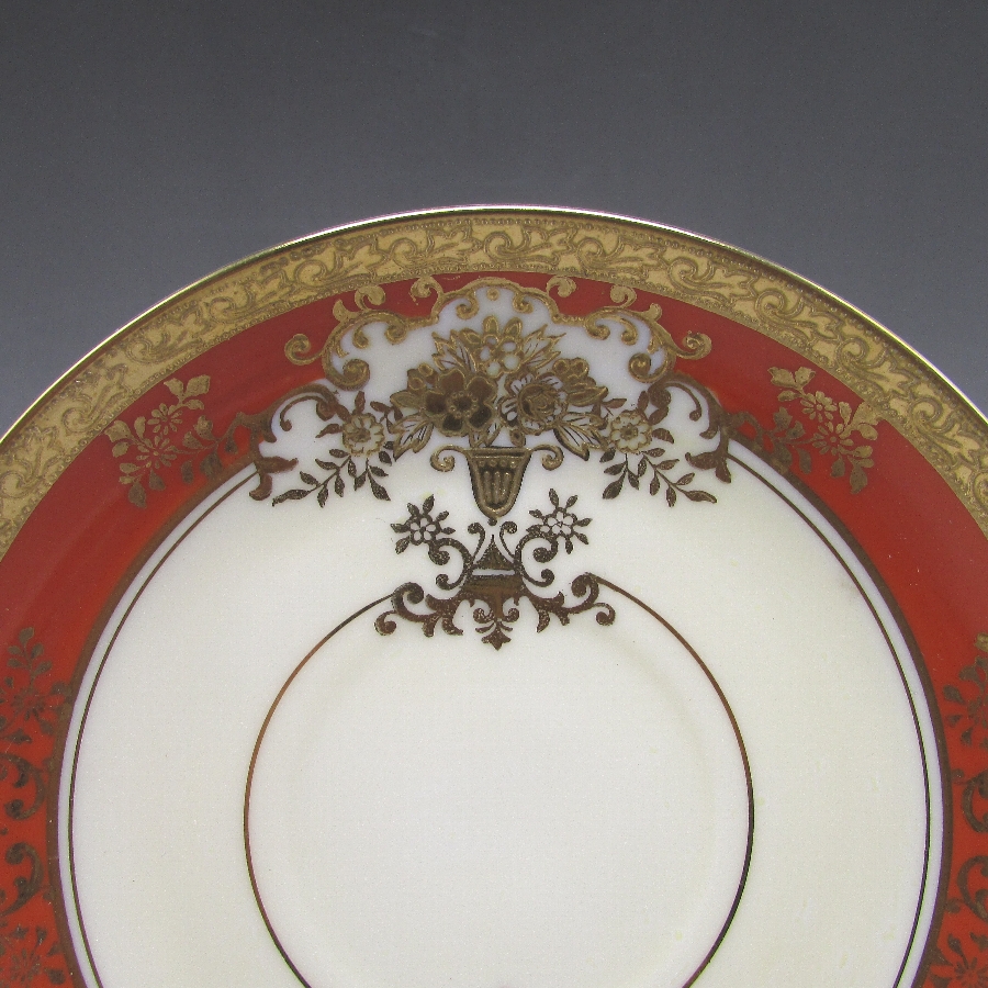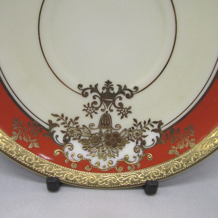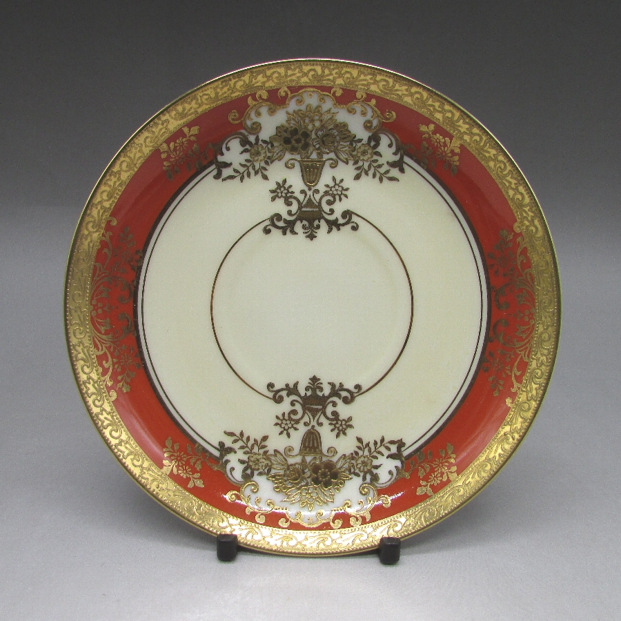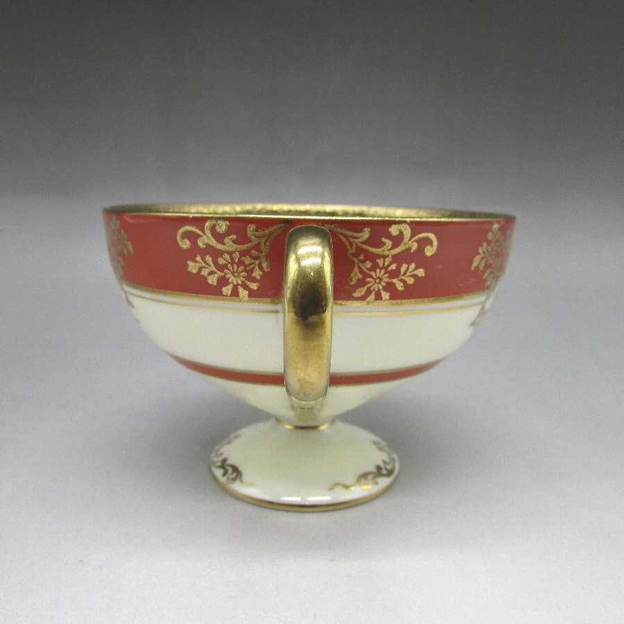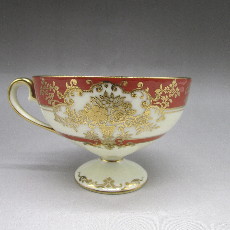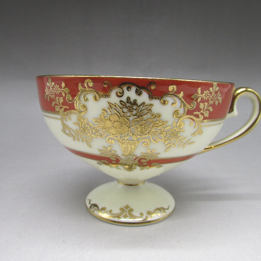 オールドノリタケの金彩唐草文ペデスタルカップ&ソーサーです。1935年頃~1941年頃にアメリカに輸出され、約100年の時を経て日本に里帰りしてきました。オールドノリタケは現在のノリタケカンパニーが明治末期から戦前までに製造したアンティーク陶磁器の総称です。豪華絢爛な西洋風絵付け陶磁器は海外で人気を博しました。近年では、約100年という長い歳月を経て日本に里帰りしてきたことで、わが国でも大変人気が高くなっており、美術工芸品として高い地位を確保しつつあります。