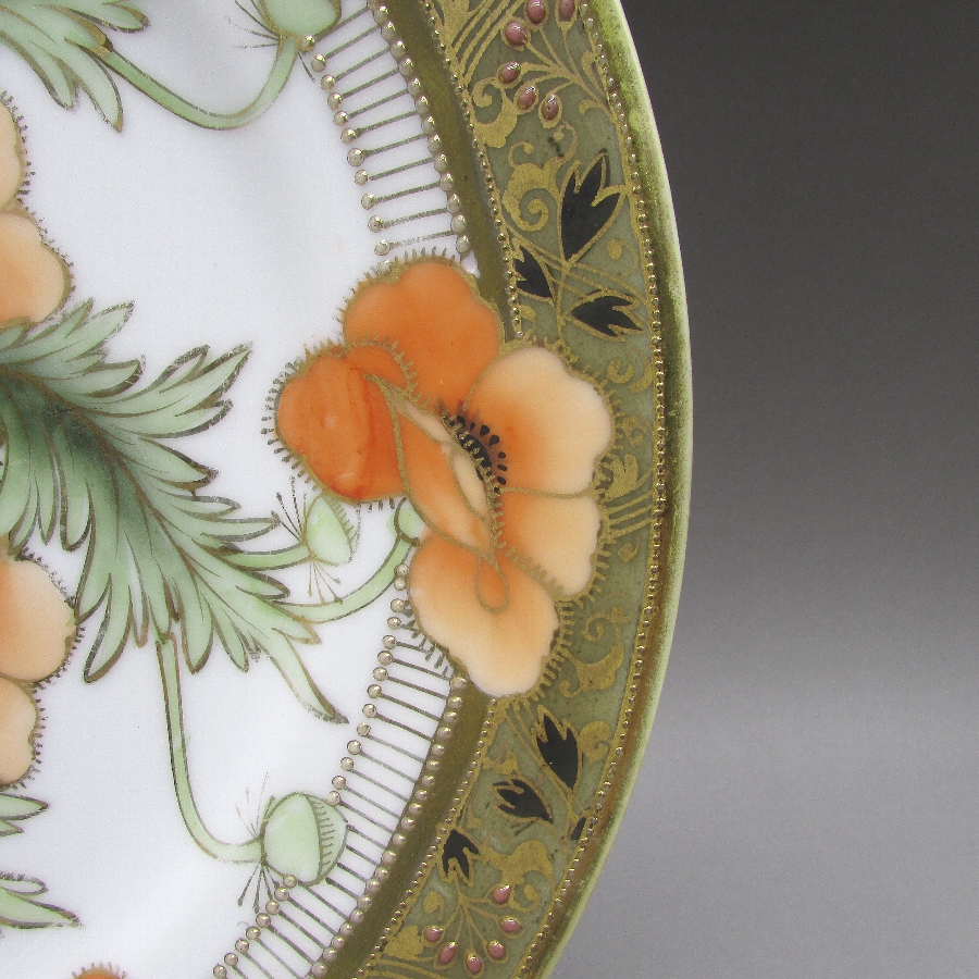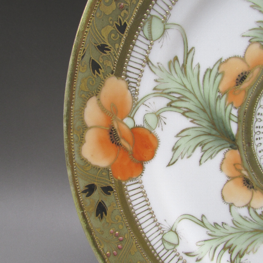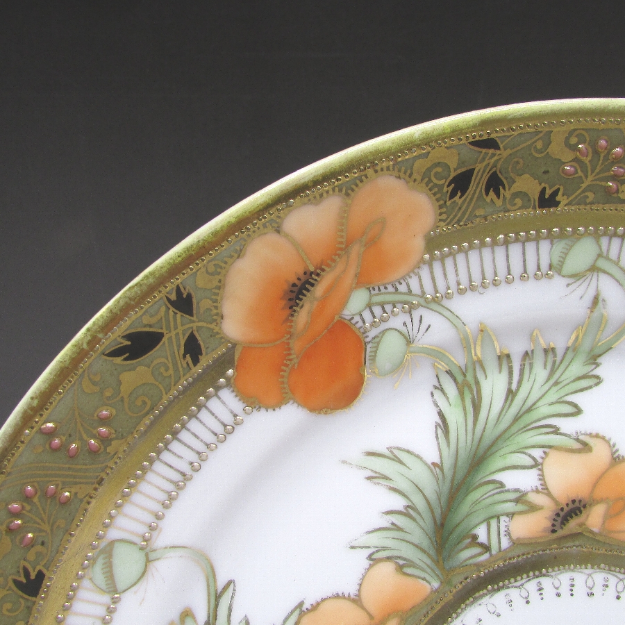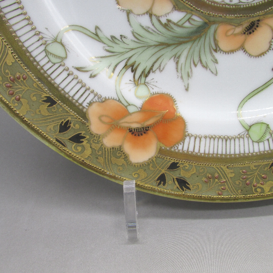 オールドノリタケの芥子花文皿です。1911年頃~1921年頃にアメリカに輸出され、約100年の時を経て日本に里帰りしてきました。オールドノリタケは現在のノリタケカンパニーが明治末期から戦前までに製造したアンティーク陶磁器の総称です。豪華絢爛な西洋風絵付け陶磁器は海外で人気を博しました。近年では、約100年という長い歳月を経て日本に里帰りしてきたことで、わが国でも大変人気が高くなっており、美術工芸品として高い地位を確保しつつあります。
