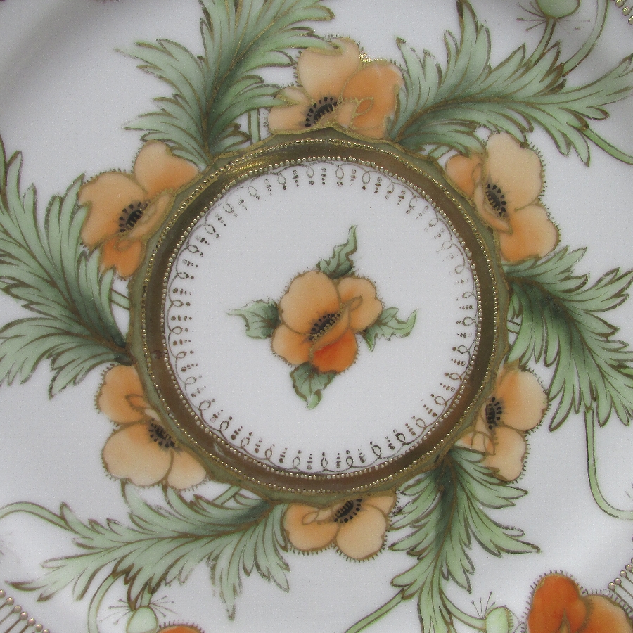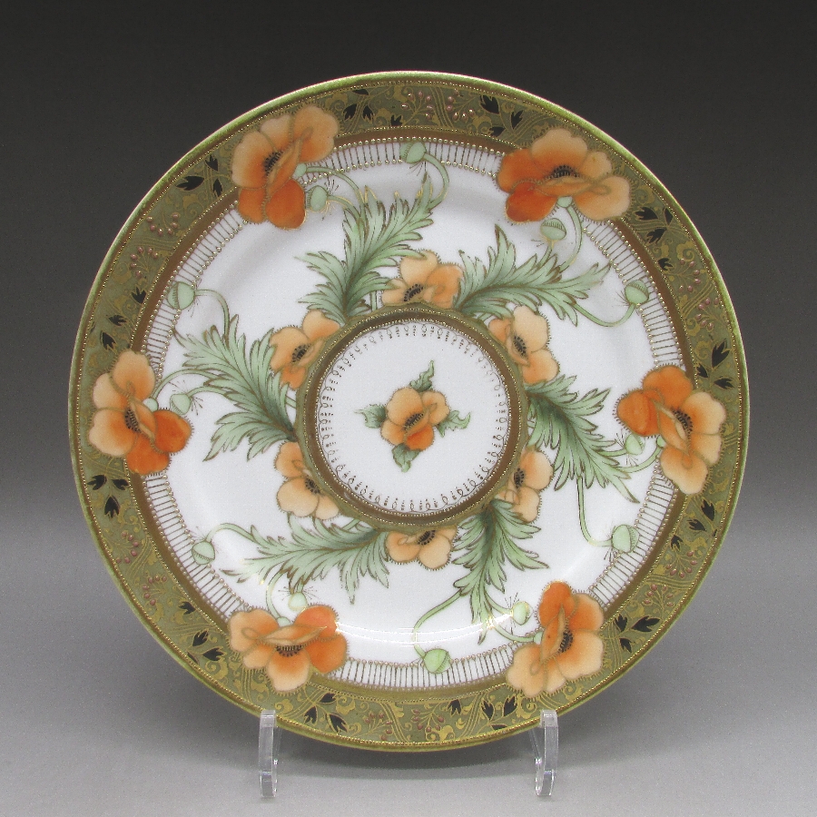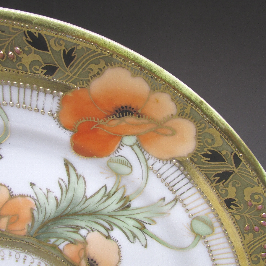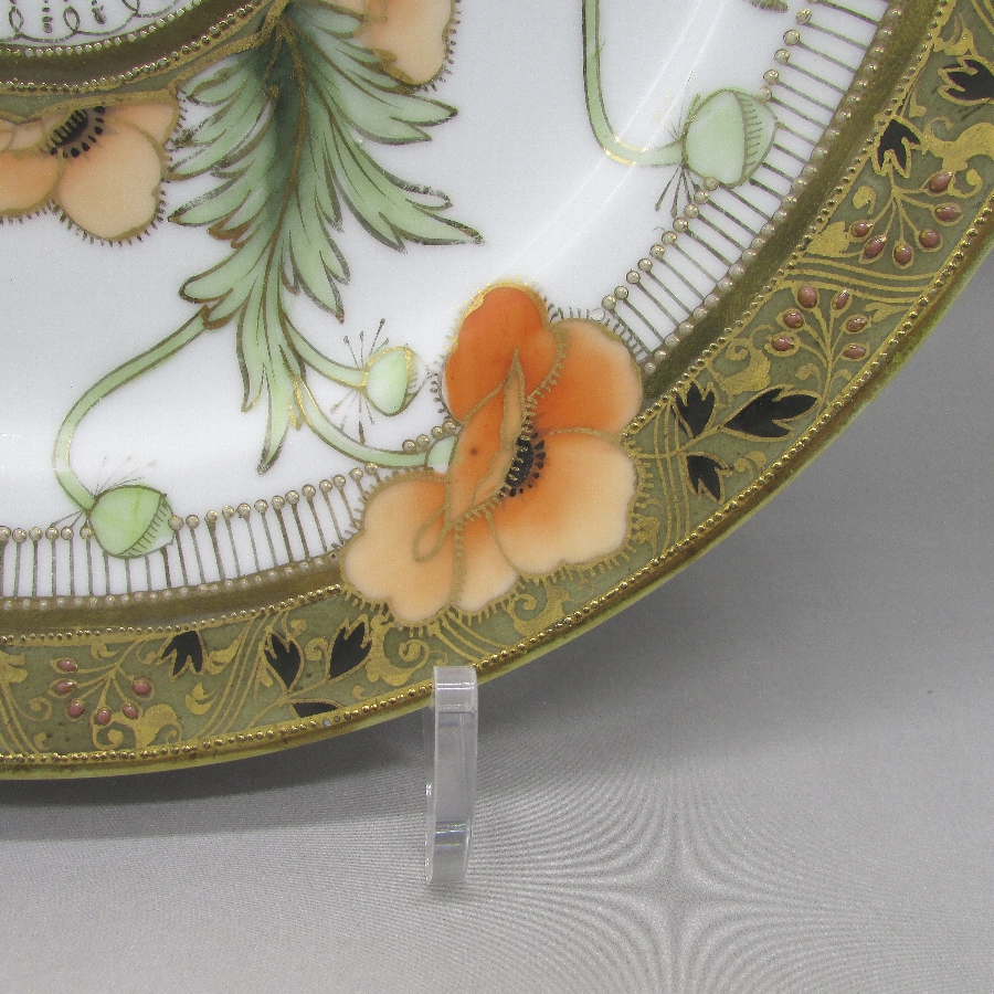 オールドノリタケの芥子花文皿です。1911年頃~1921年頃にアメリカに輸出され、約100年の時を経て日本に里帰りしてきました。オールドノリタケは現在のノリタケカンパニーが明治末期から戦前までに製造したアンティーク陶磁器の総称です。豪華絢爛な西洋風絵付け陶磁器は海外で人気を博しました。近年では、約100年という長い歳月を経て日本に里帰りしてきたことで、わが国でも大変人気が高くなっており、美術工芸品として高い地位を確保しつつあります。
