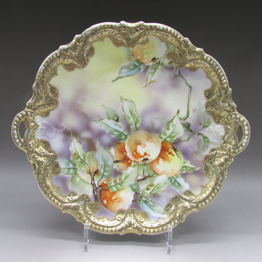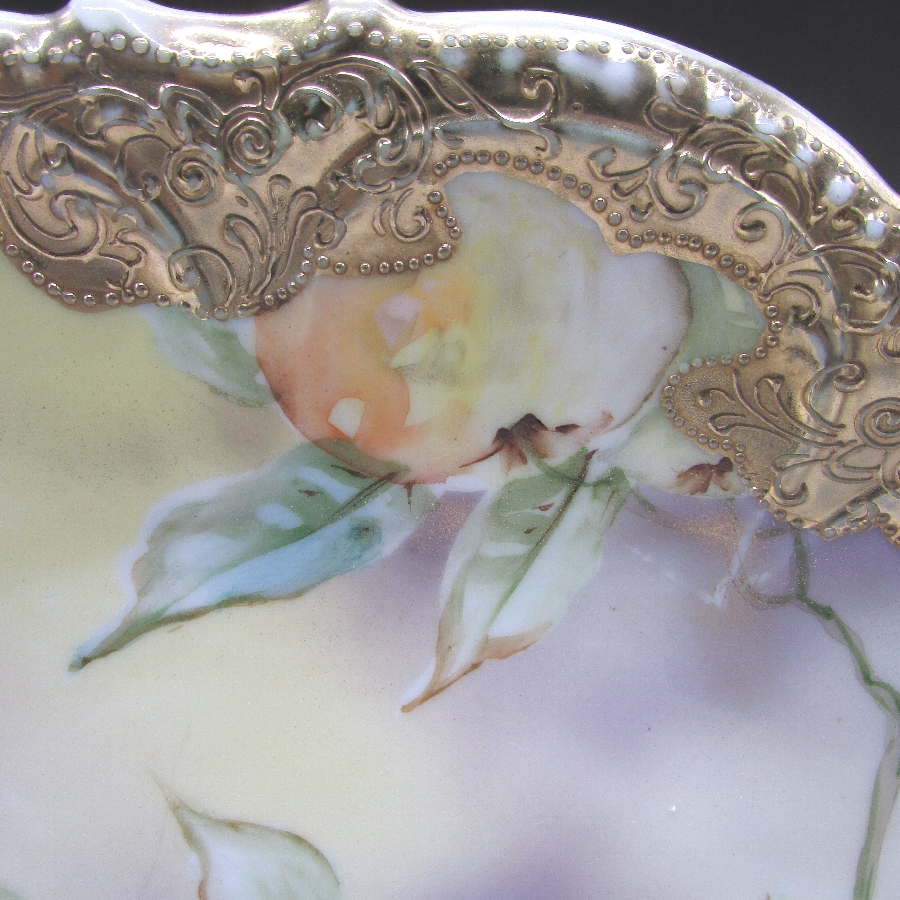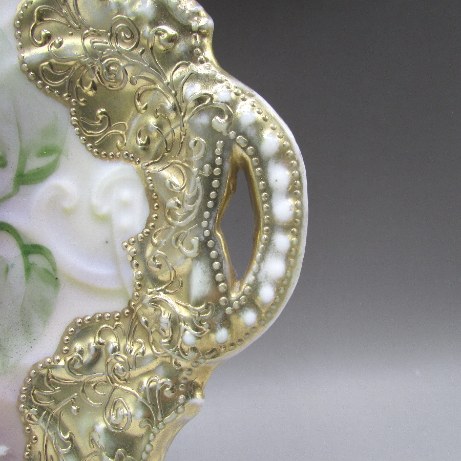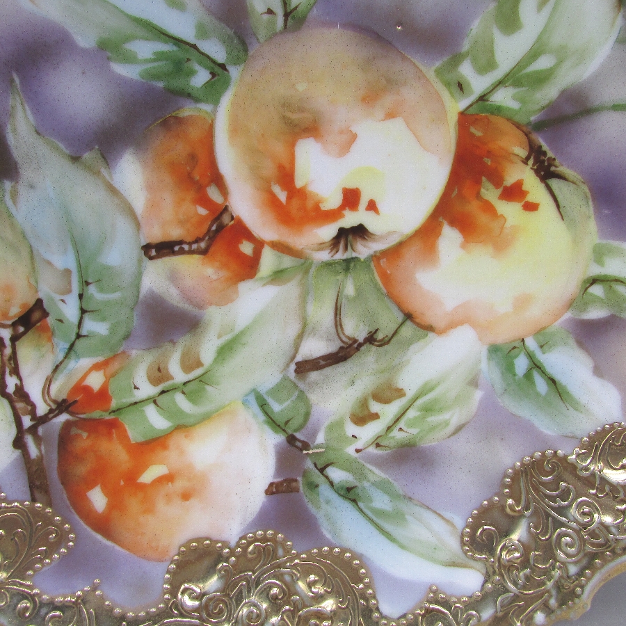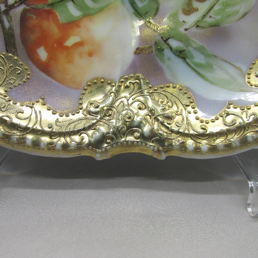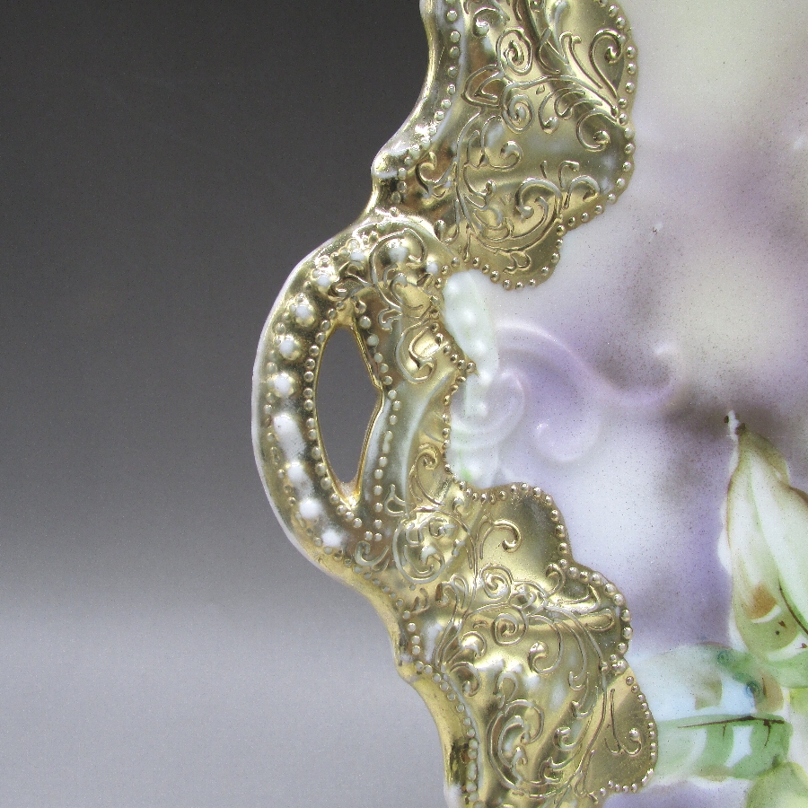 オールドノリタケの金盛り果物文皿です。1891年頃~1915年頃にアメリカに輸出され、約100年の時を経て日本に里帰りしてきました。オールドノリタケは現在のノリタケカンパニーが明治末期から戦前までに製造したアンティーク陶磁器の総称です。豪華絢爛な西洋風絵付け陶磁器は海外で人気を博しました。近年では、約100年という長い歳月を経て日本に里帰りしてきたことで、わが国でも大変人気が高くなっており、美術工芸品として高い地位を確保しつつあります。