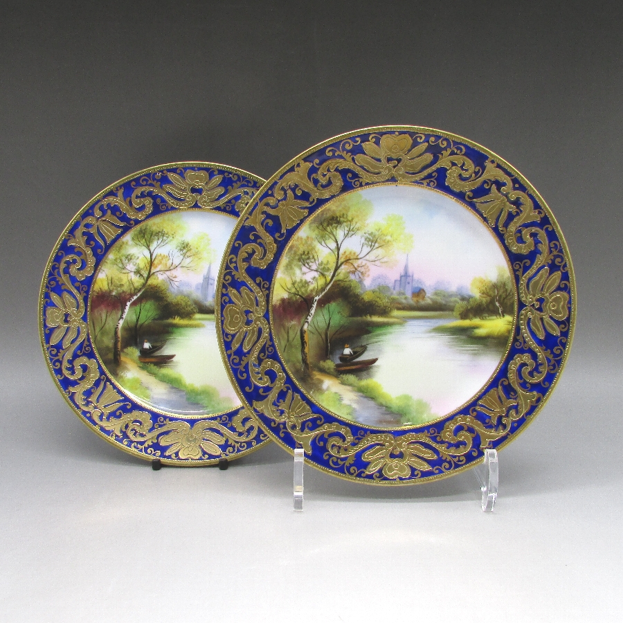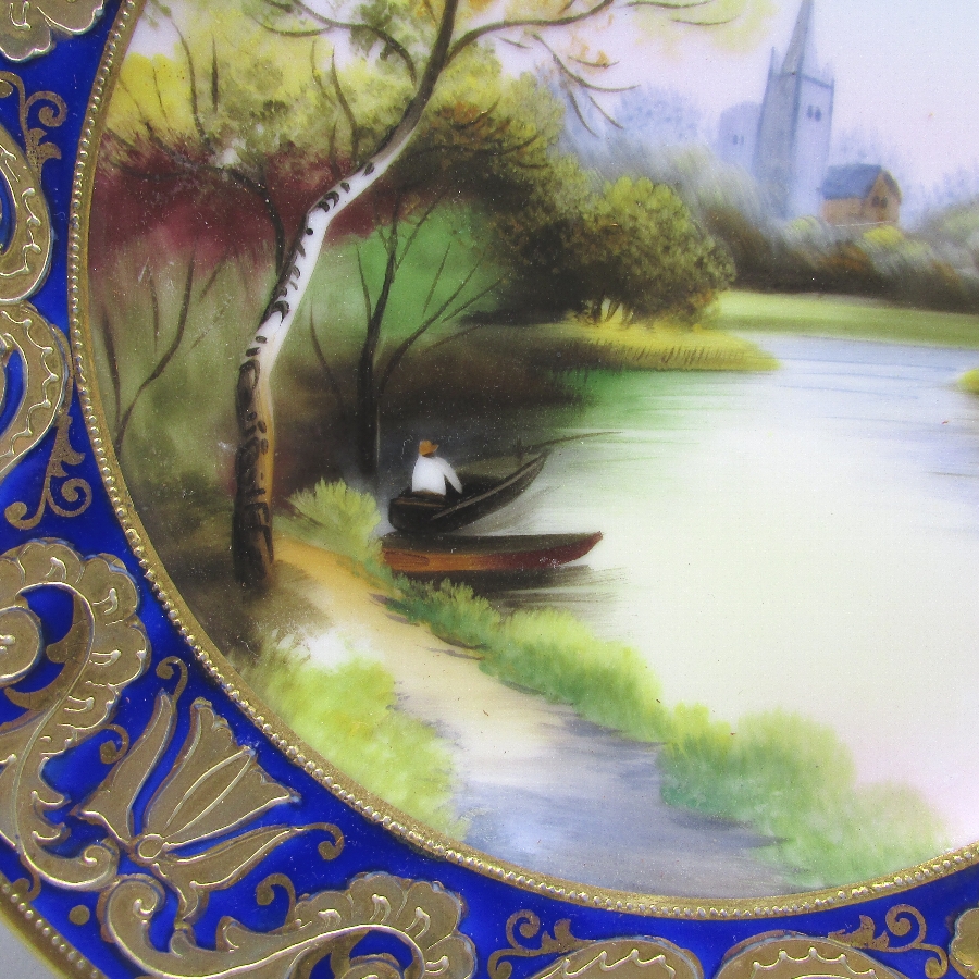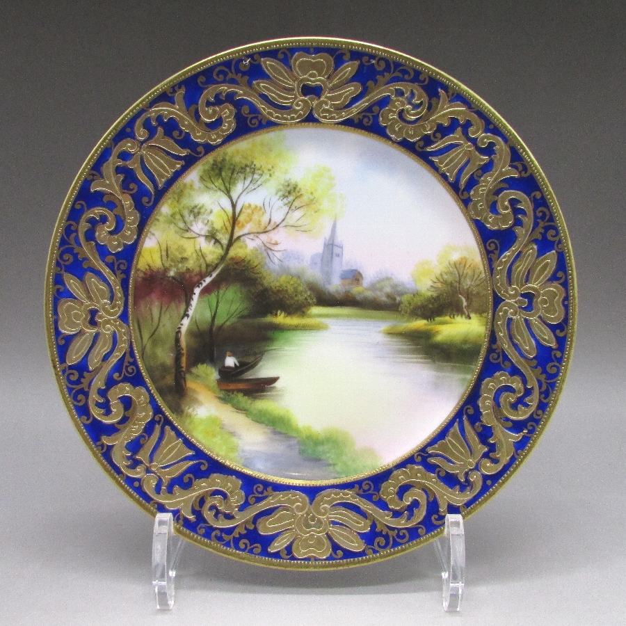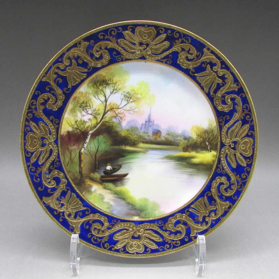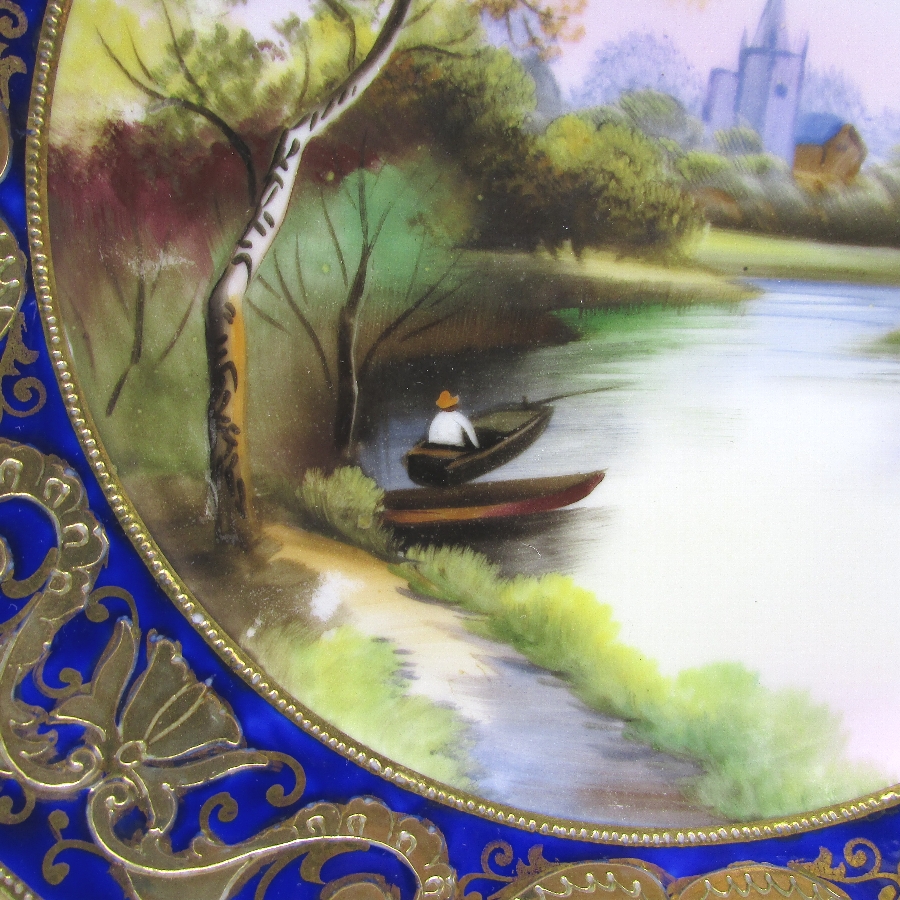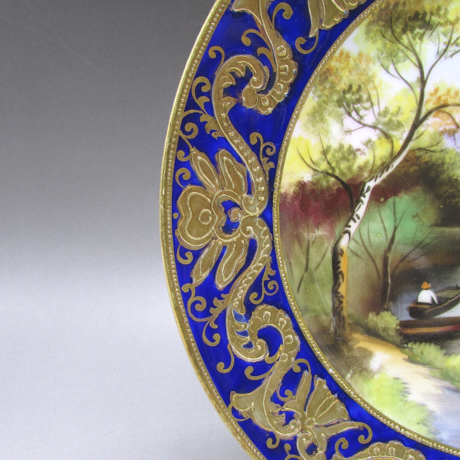 オールドノリタケのコバルト金盛り風景文皿です。1906年頃~1925年頃にイギリスに輸出され、約100年の時を経て日本に里帰りしてきました。川辺に釣船、遠くには街を描き、周囲を金盛り装飾で豪華絢爛に仕上げた作品です。金盛り装飾は高級品の代表的な装飾技法で、点や線などを泥漿で描き、焼成した後に金液を筆などで塗り被せて仕上げる技法です。オールドノリタケでよく用いられている金液は金の延棒を濃塩酸と濃硝酸を体積比で3対1に混ぜた溶液で溶解し液状にしたものを使用していました。