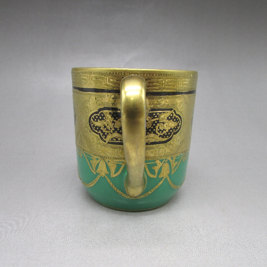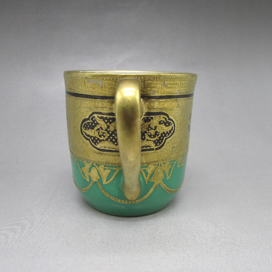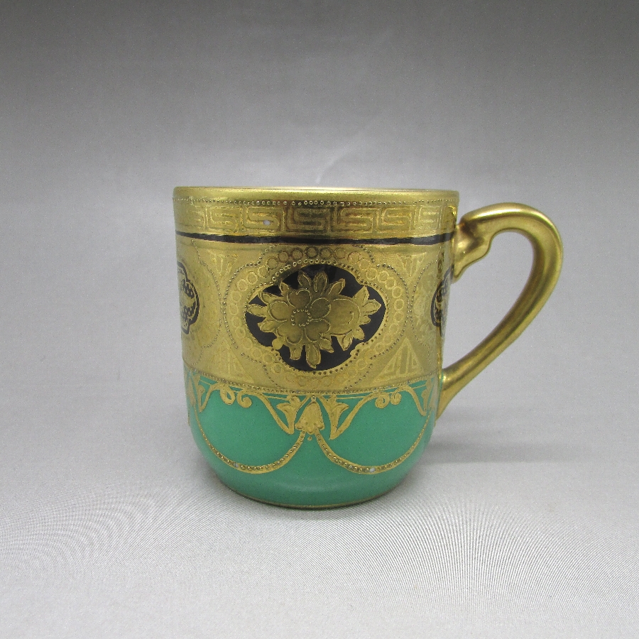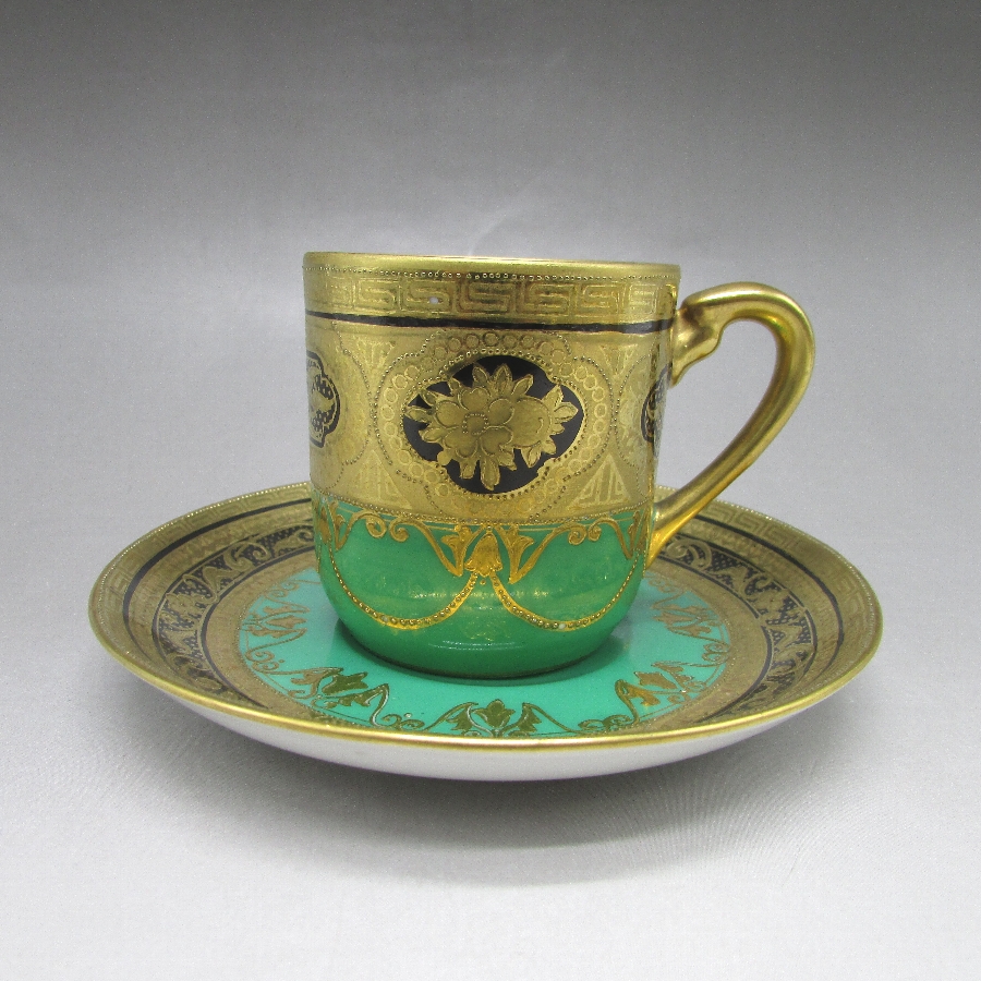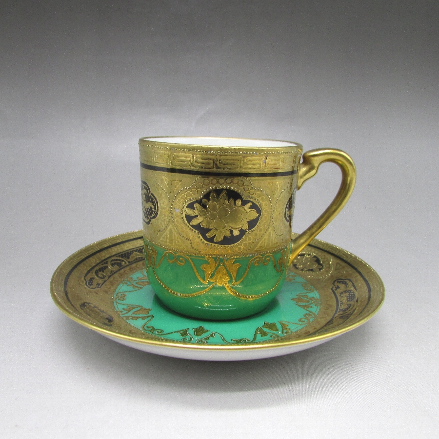 オールドノリタケの金盛り唐草文ティーポット&カップ2客です。1906年頃~1925年頃にイギリスに輸出され、約100年の時を経て日本に里帰りしてきました。オールドノリタケは現在のノリタケカンパニーが明治末期から戦前までに製造したアンティーク陶磁器の総称です。豪華絢爛な西洋風絵付け陶磁器は海外で人気を博しました。近年では、約100年という長い歳月を経て日本に里帰りしてきたことで、わが国でも大変人気が高くなっており、美術工芸品として高い地位を確保しつつあります。