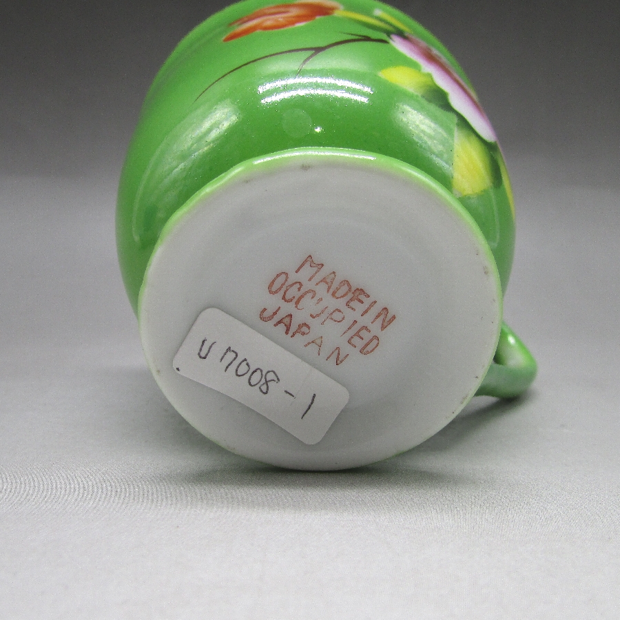 オキュパイド・ジャパンの花文カップ&ソーサーです。オキュパイド・ジャパンとは日本が連合国軍の占領下にあった1947年から1952年までの間に、日本の輸出品に義務付けられていた「占領下の日本製」という意味の表記です。敗戦直後の厳しい状況にもかかわらず、ものづくりを通して復興を目指し、人々が誇りを取り戻そうとしたエネルギーや熱意が込められています。輸出品であったため国内には数が少なく、今ではコレクターズアイテムとして人気を集めています。