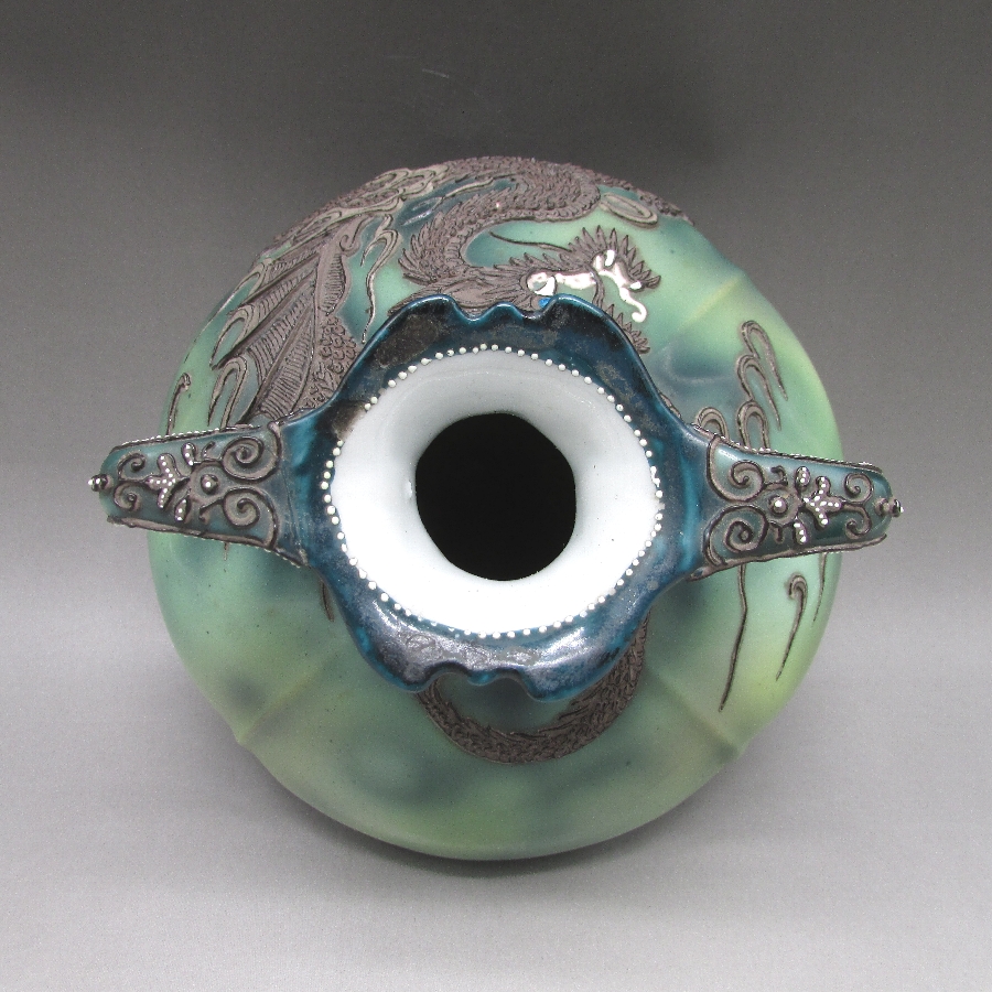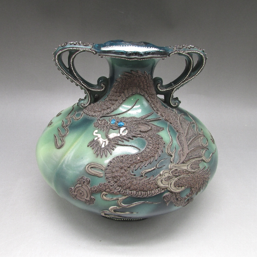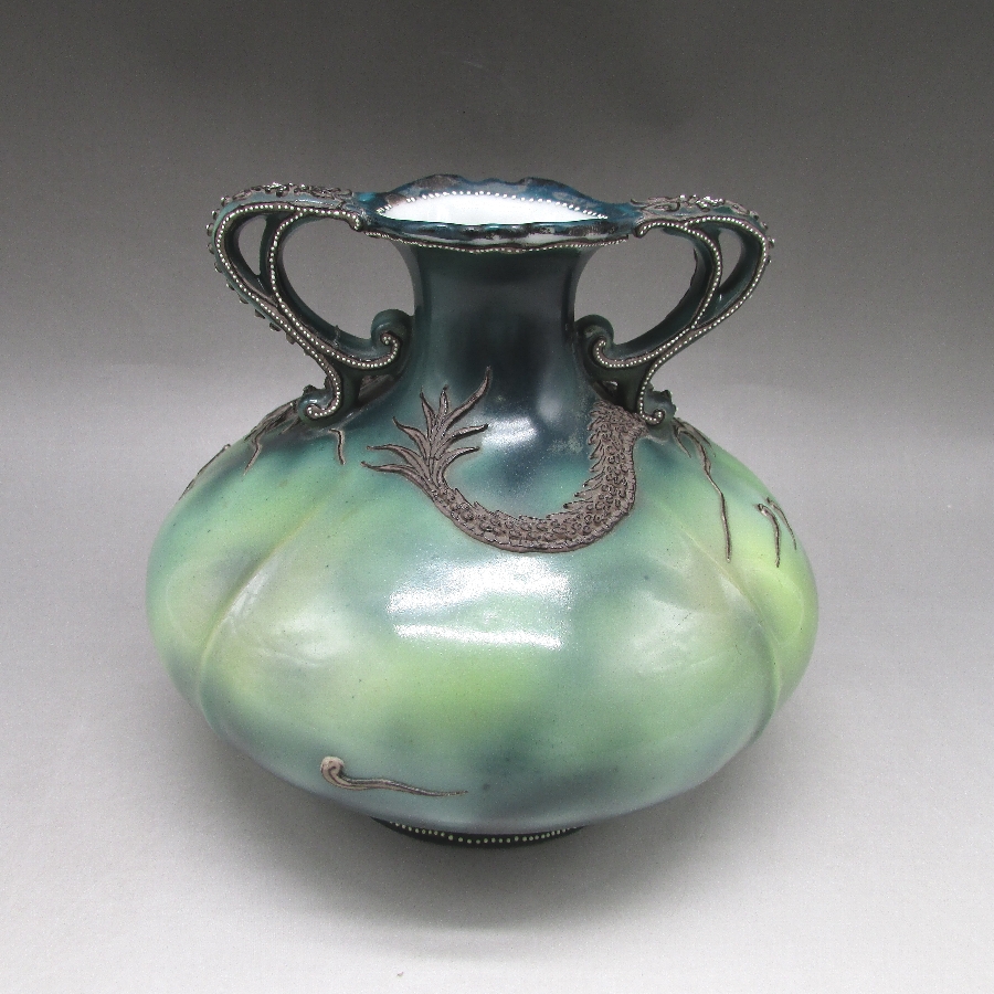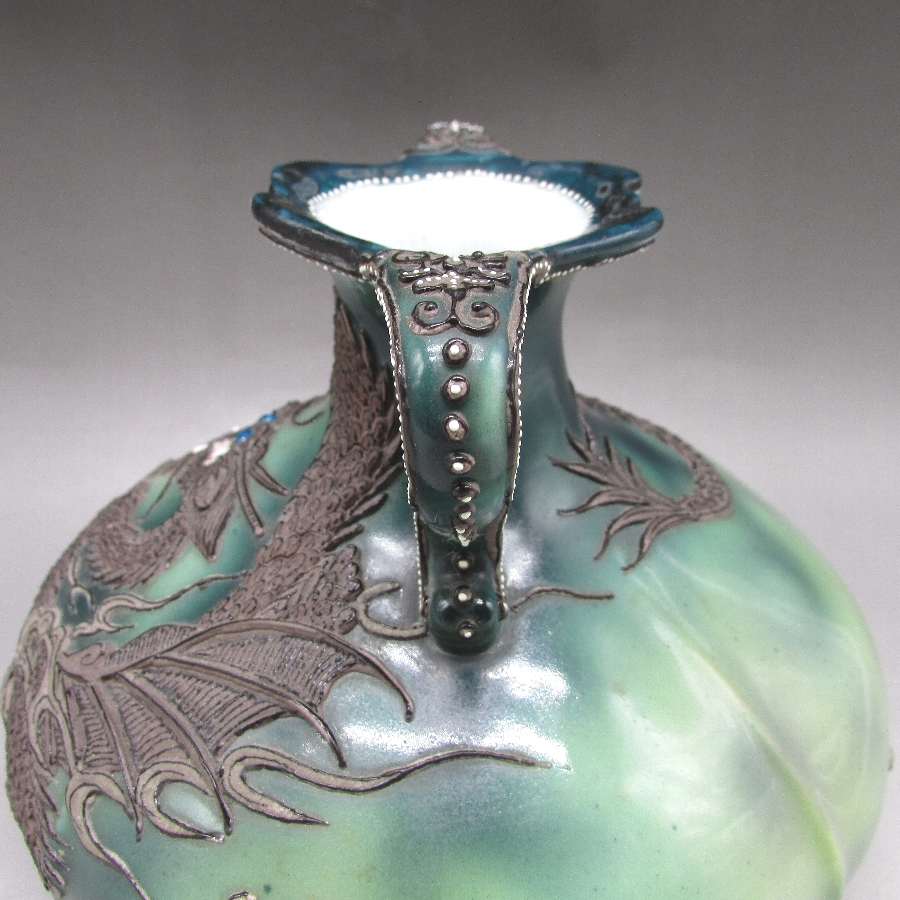オールドノリタケの龍盛り上げ花瓶です。1900年頃~1910年頃にイギリスに輸出され、約100年の時を経て日本に里帰りしてきました。オールドノリタケは現在のノリタケカンパニーが明治末期から戦前までに製造したアンティーク陶磁器の総称です。豪華絢爛な西洋風絵付け陶磁器は海外で人気を博しました。近年では、約100年という長い歳月を経て日本に里帰りしてきたことで、わが国でも大変人気が高くなっており、美術工芸品として高い地位を確保しつつあります。