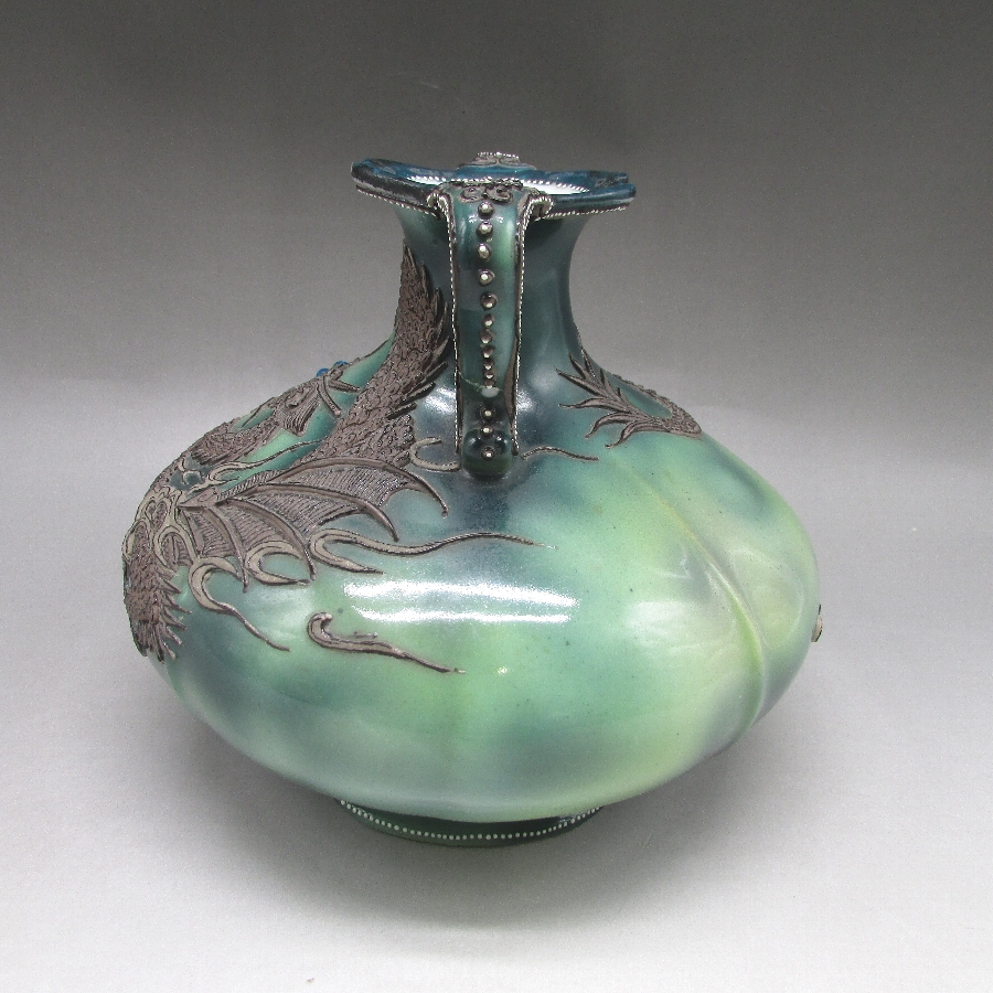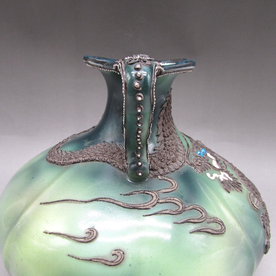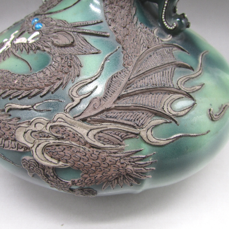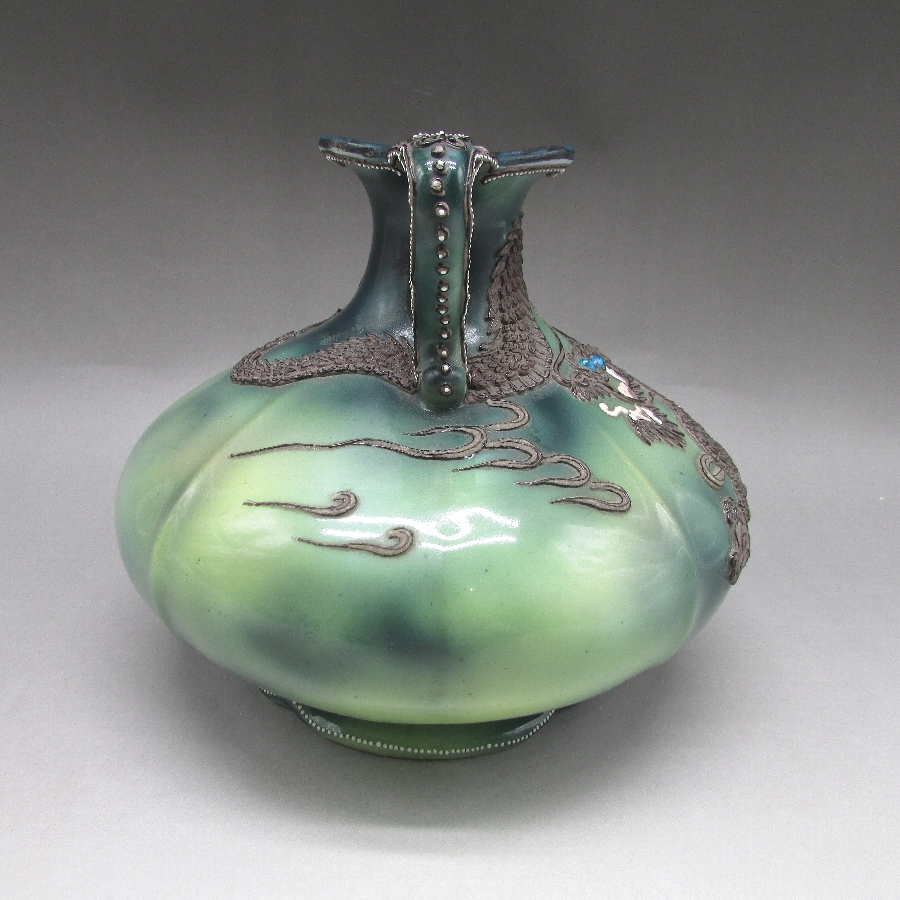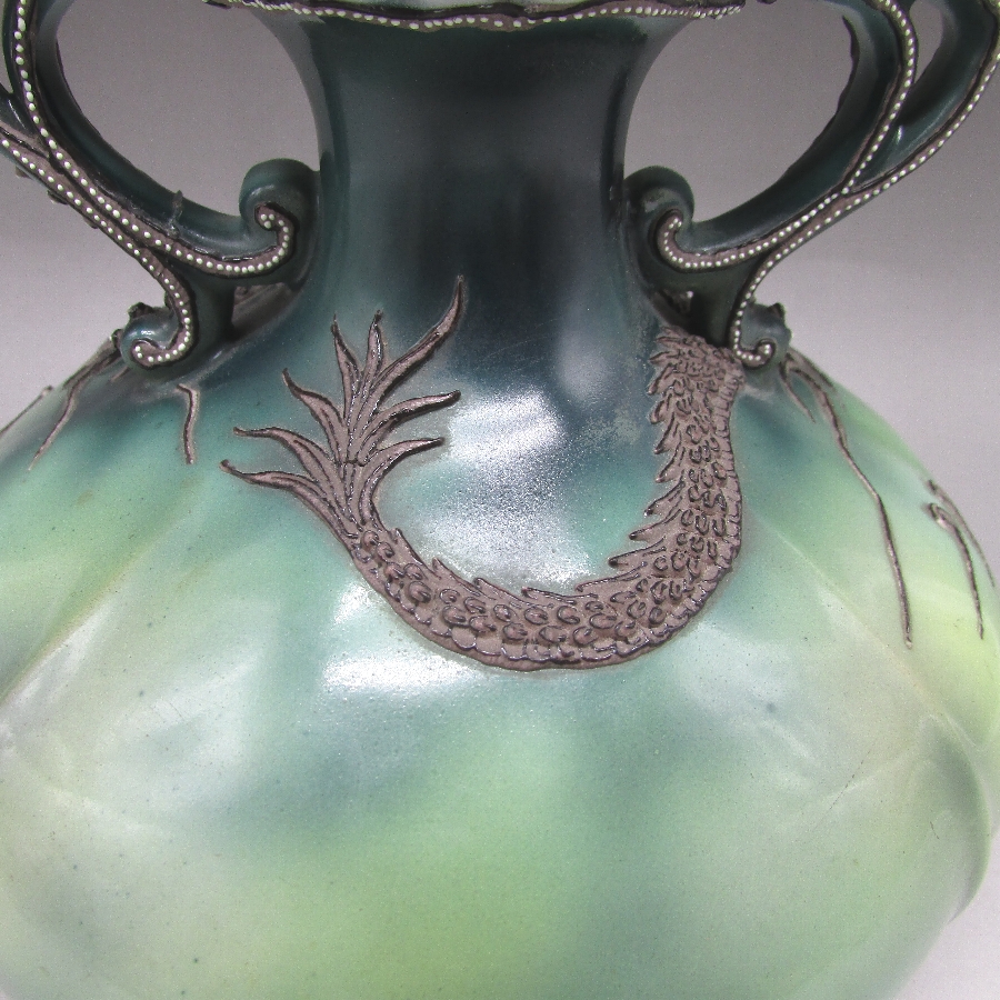 オールドノリタケの龍盛り上げ花瓶です。1900年頃~1910年頃にイギリスに輸出され、約100年の時を経て日本に里帰りしてきました。オールドノリタケは現在のノリタケカンパニーが明治末期から戦前までに製造したアンティーク陶磁器の総称です。豪華絢爛な西洋風絵付け陶磁器は海外で人気を博しました。近年では、約100年という長い歳月を経て日本に里帰りしてきたことで、わが国でも大変人気が高くなっており、美術工芸品として高い地位を確保しつつあります。