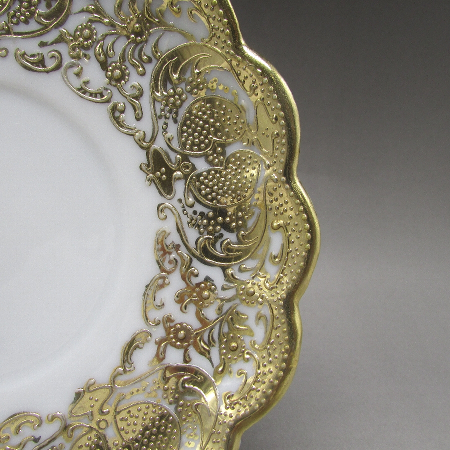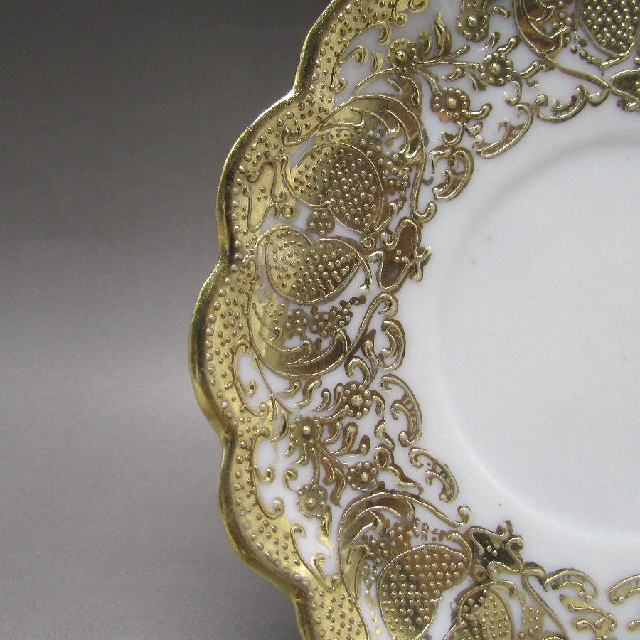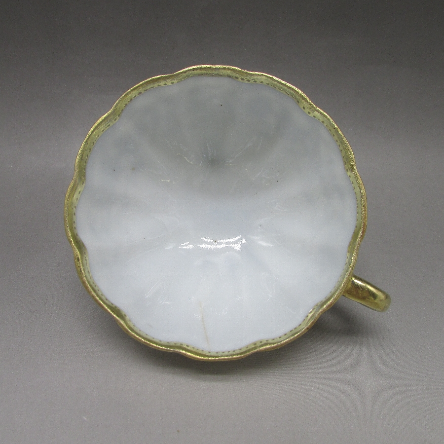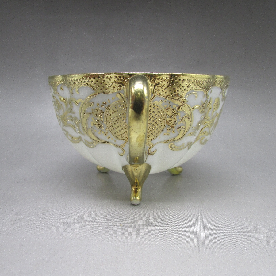 オールドノリタケの金盛り唐草文足付カップ&ソーサーです。1891年頃~1915年頃にアメリカに輸出され、約100年の時を経て日本に里帰りしてきました。オールドノリタケは現在のノリタケカンパニーが明治末期から戦前までに製造したアンティーク陶磁器の総称です。豪華絢爛な西洋風絵付け陶磁器は海外で人気を博しました。近年では、約100年という長い歳月を経て日本に里帰りしてきたことで、わが国でも大変人気が高くなっており、美術工芸品として高い地位を確保しつつあります。