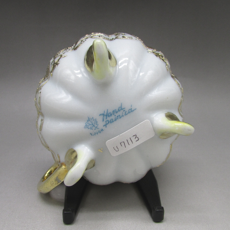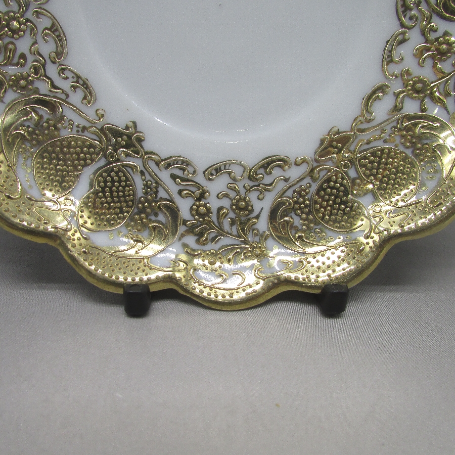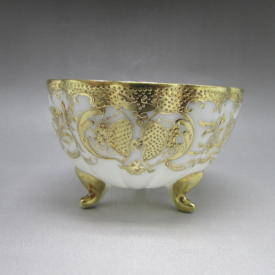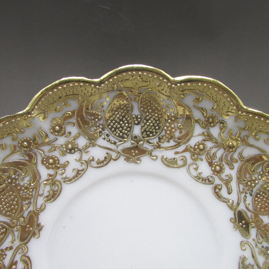 オールドノリタケの金盛り唐草文足付カップ&ソーサーです。1891年頃~1915年頃にアメリカに輸出され、約100年の時を経て日本に里帰りしてきました。オールドノリタケは現在のノリタケカンパニーが明治末期から戦前までに製造したアンティーク陶磁器の総称です。豪華絢爛な西洋風絵付け陶磁器は海外で人気を博しました。近年では、約100年という長い歳月を経て日本に里帰りしてきたことで、わが国でも大変人気が高くなっており、美術工芸品として高い地位を確保しつつあります。