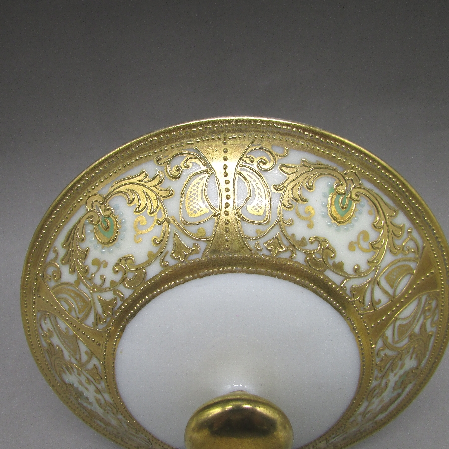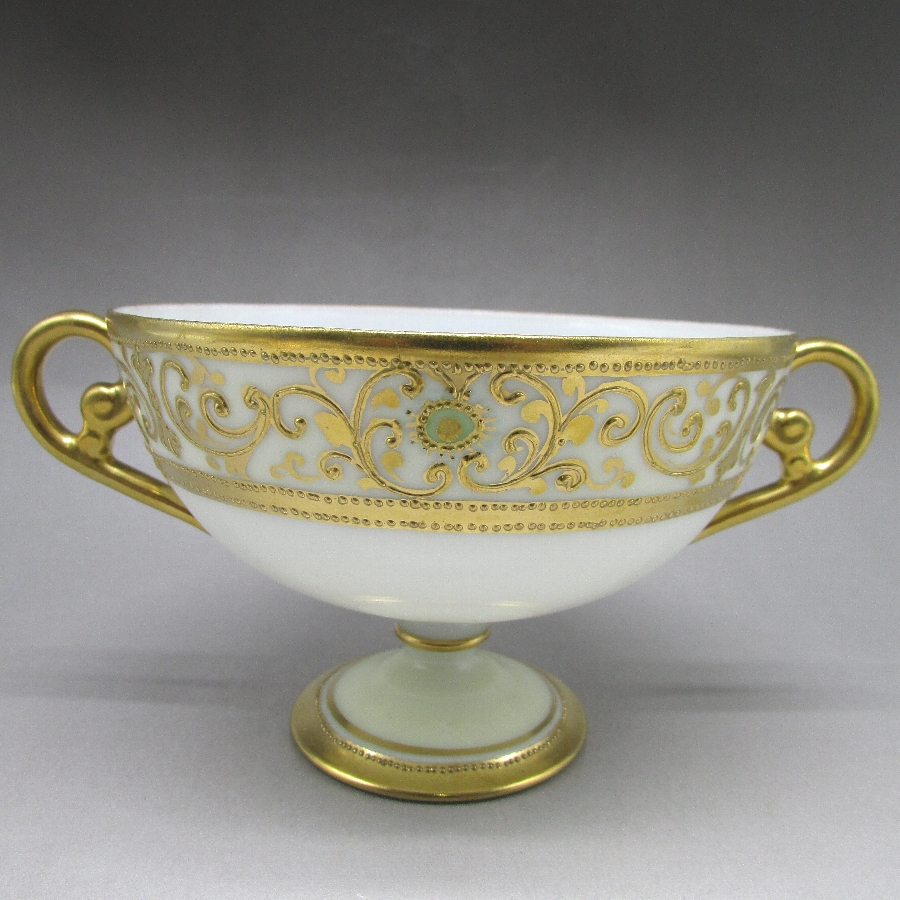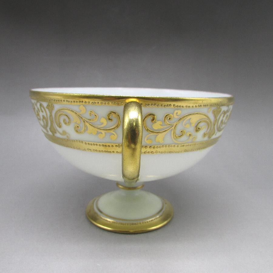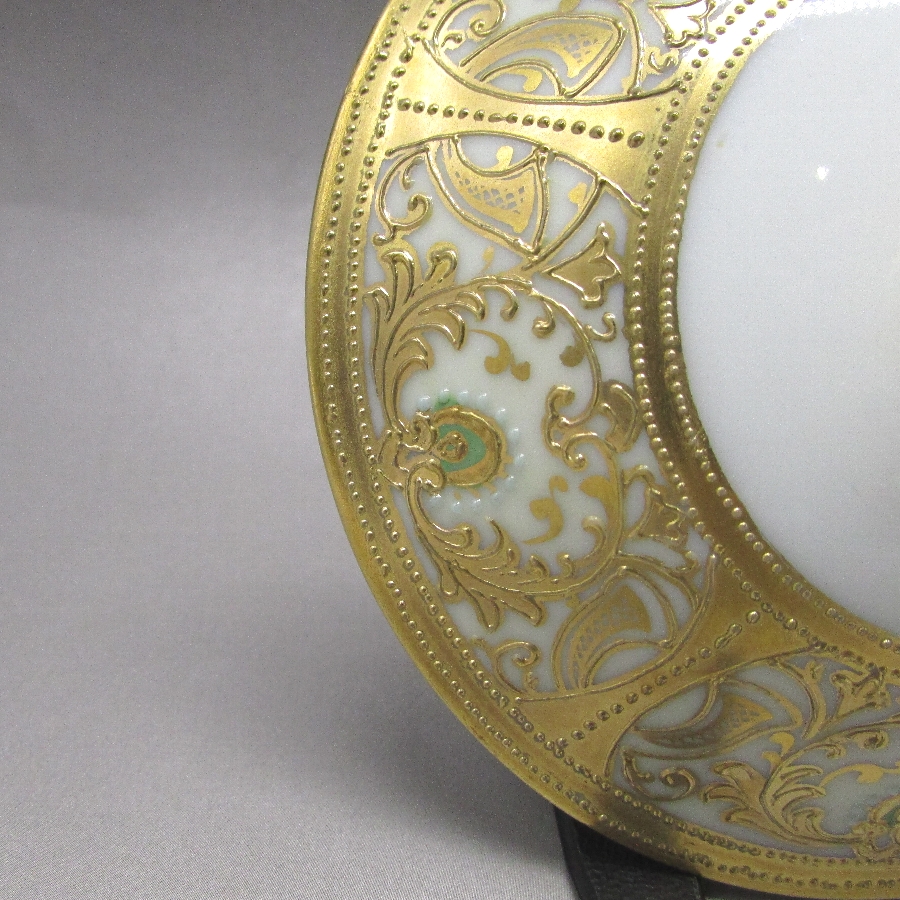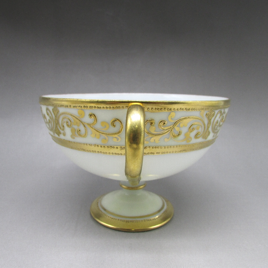 オールドノリタケの金盛り唐草文スープカップです。1911年頃~1921年頃にアメリカに輸出され、約100年の時を経て日本に里帰りしてきました。オールドノリタケは現在のノリタケカンパニーが明治末期から戦前までに製造したアンティーク陶磁器の総称です。豪華絢爛な西洋風絵付け陶磁器は海外で人気を博しました。近年では、約100年という長い歳月を経て日本に里帰りしてきたことで、わが国でも大変人気が高くなっており、美術工芸品として高い地位を確保しつつあります。