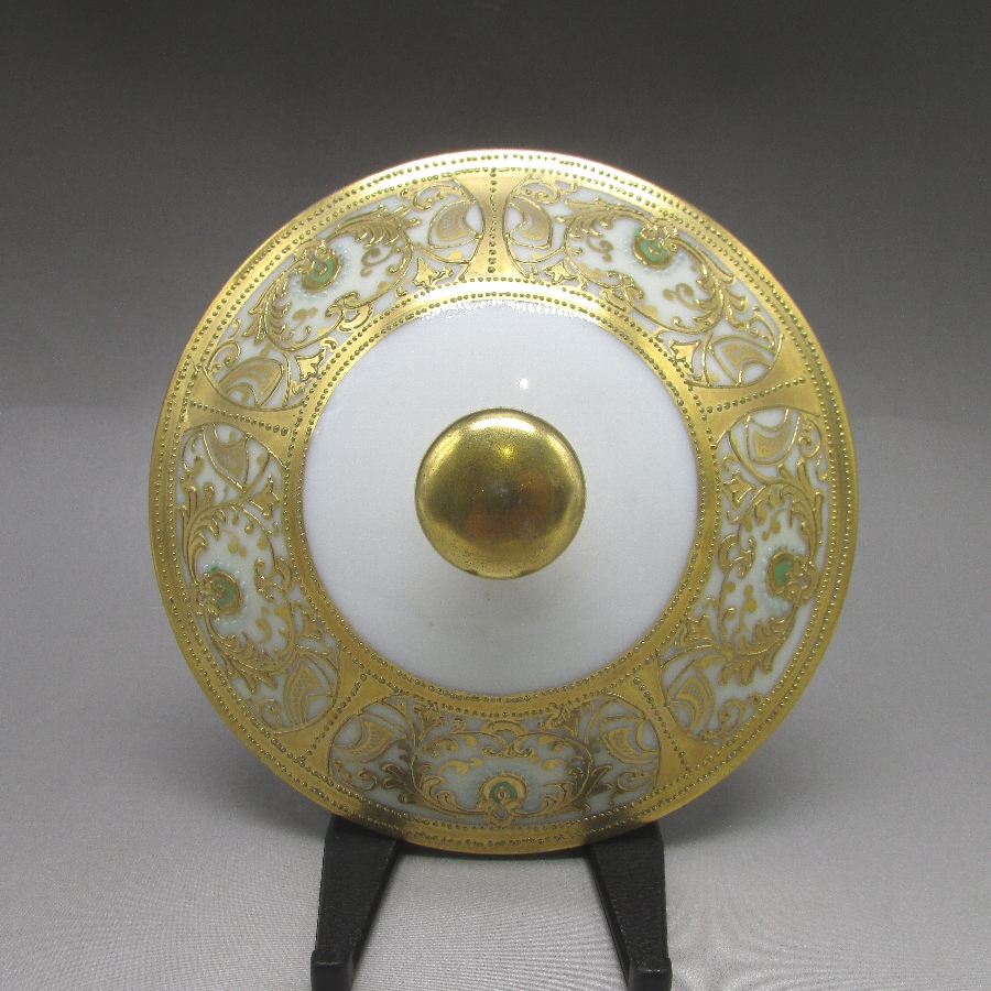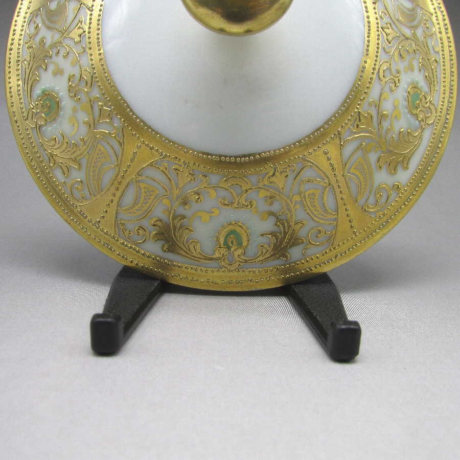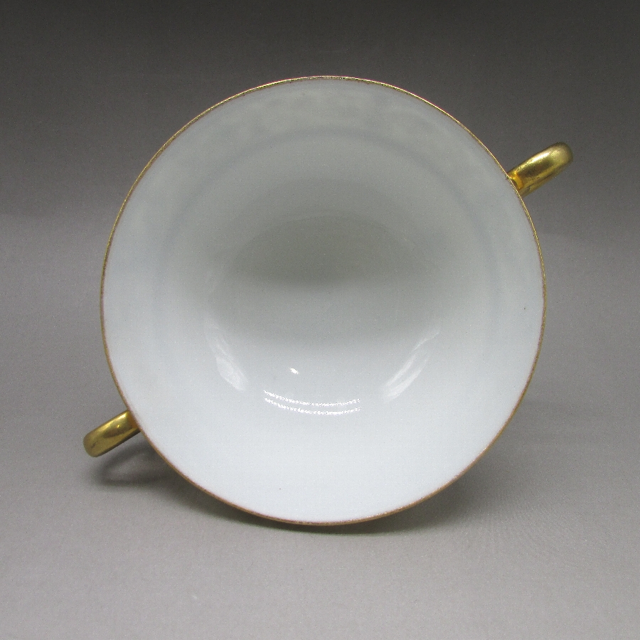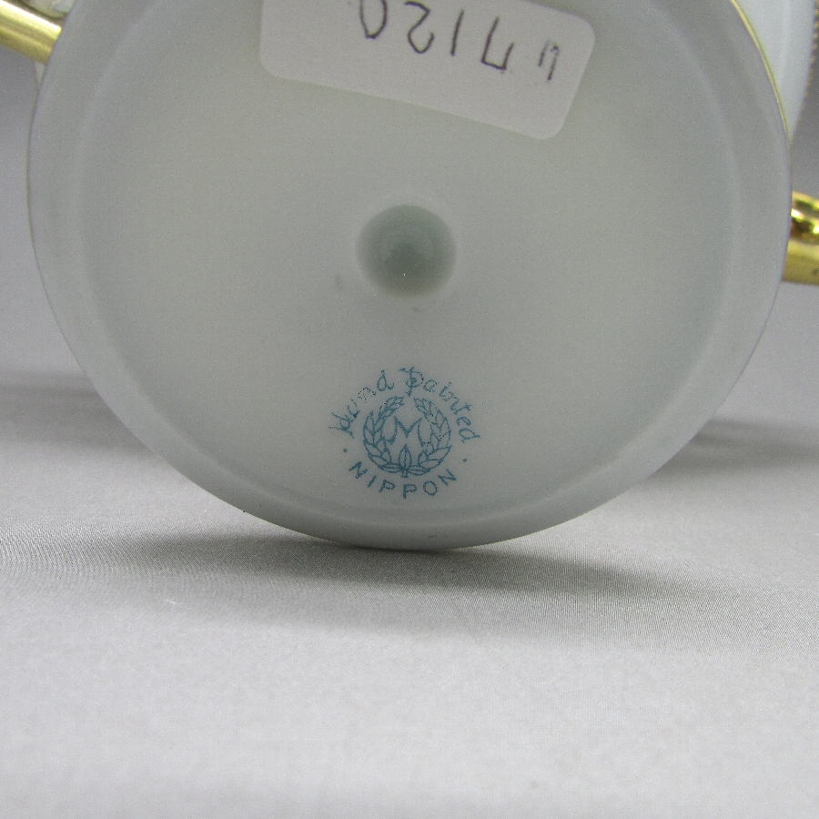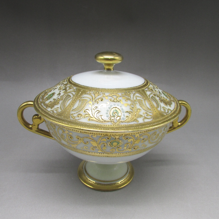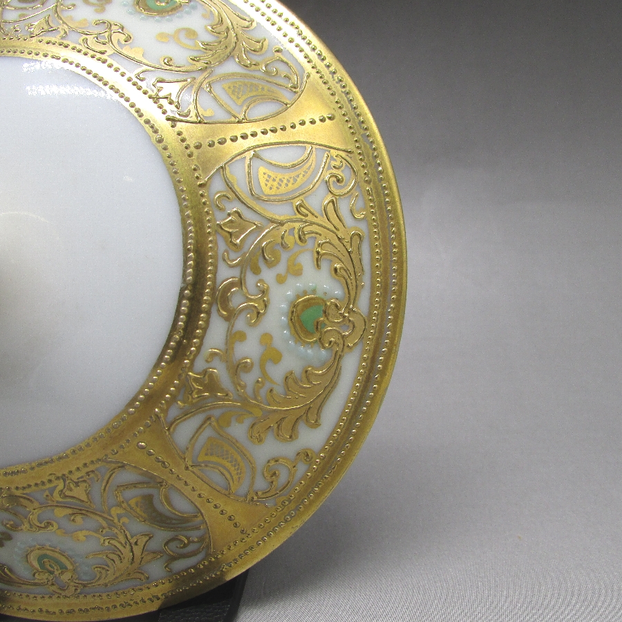 オールドノリタケの金盛り唐草文スープカップです。1911年頃~1921年頃にアメリカに輸出され、約100年の時を経て日本に里帰りしてきました。オールドノリタケは現在のノリタケカンパニーが明治末期から戦前までに製造したアンティーク陶磁器の総称です。豪華絢爛な西洋風絵付け陶磁器は海外で人気を博しました。近年では、約100年という長い歳月を経て日本に里帰りしてきたことで、わが国でも大変人気が高くなっており、美術工芸品として高い地位を確保しつつあります。