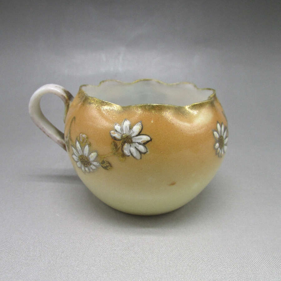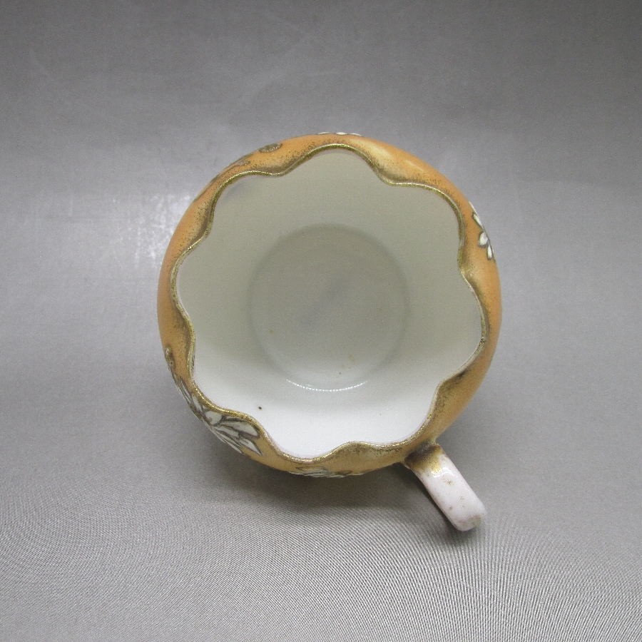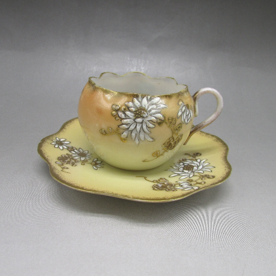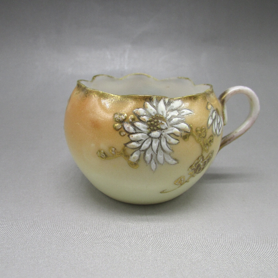 加藤春光の瀬戸焼の花文洋茶碗です。明治・大正時代に欧米諸国に輸出され、約100年の時を経て日本に里帰りしてきました。春光が得意とした「卵ぼかし」に菊を盛り上げ装飾した見事な純和モダンなデザインが欧米人を魅了しました。