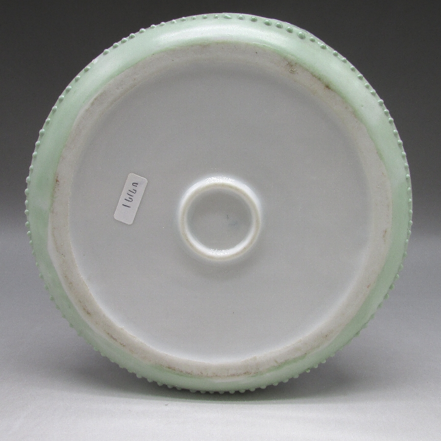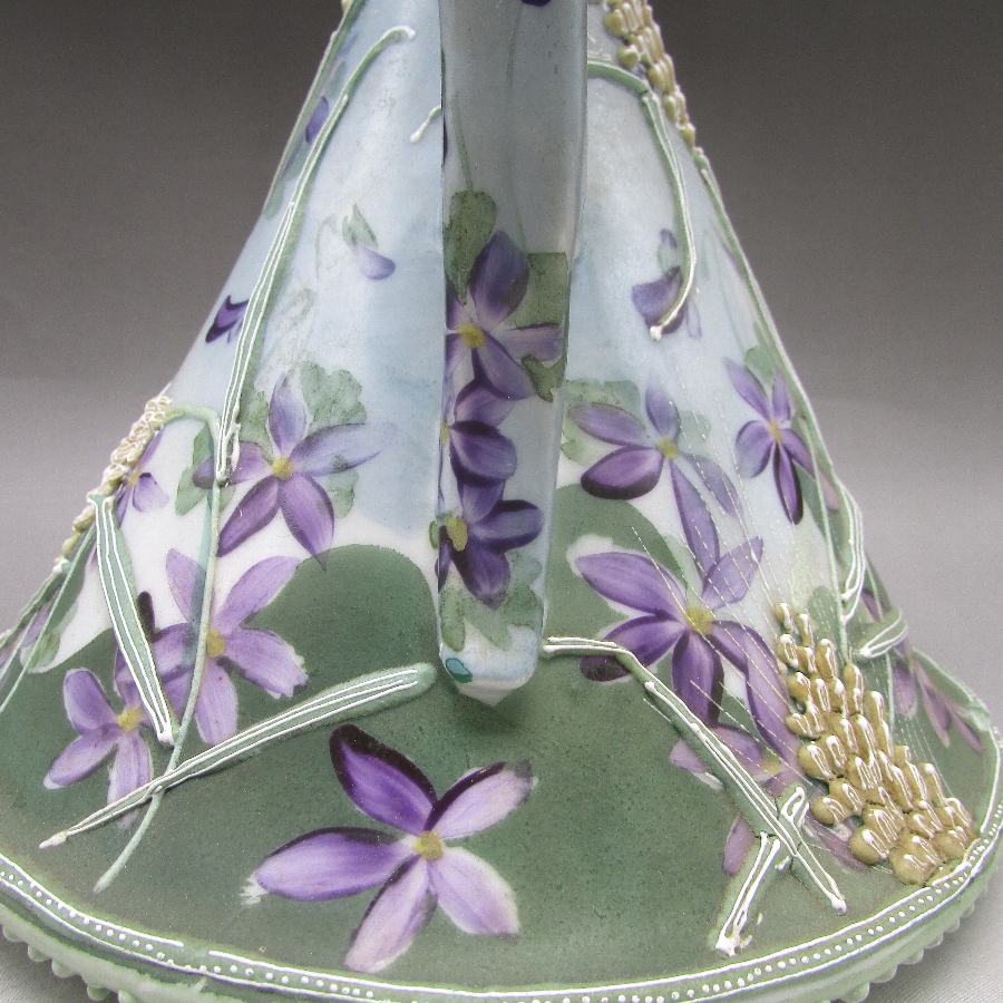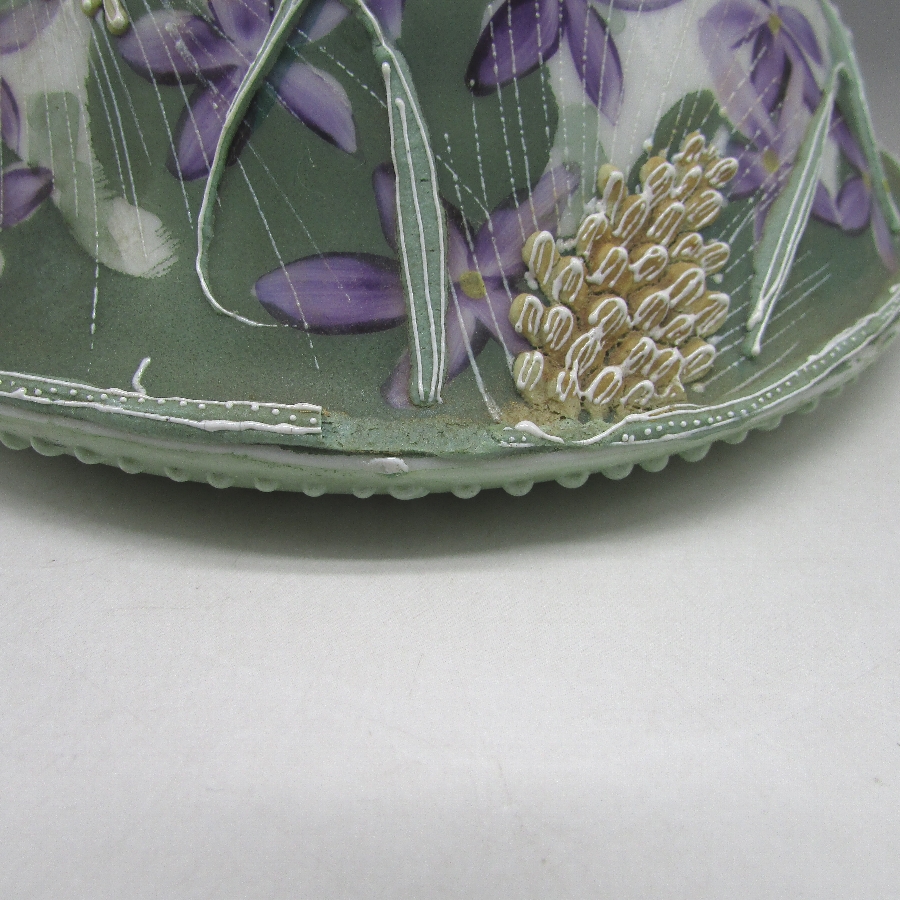of NIPPON PORCELAIN」(Joan Van Patten/1979・COLLECTOR BOOKS)に裏印違いの作品が掲載されています。盛り上げは、陶磁器を立体的に見せる技法でオールドノリタケの最も代表的な技法です。古くは宋時代の中国や17世紀のイギリスなどにもあったようです。今や欧米でも「MORIAGE」という名で通じ程、高く評価されています。装飾方法はデコレーションケーキを飾る時に使用する生クリームを絞り出すような道具を用いて装飾を行います。職人の精緻な装飾技術で、現代では再現不可能な希少な装飾方法です。