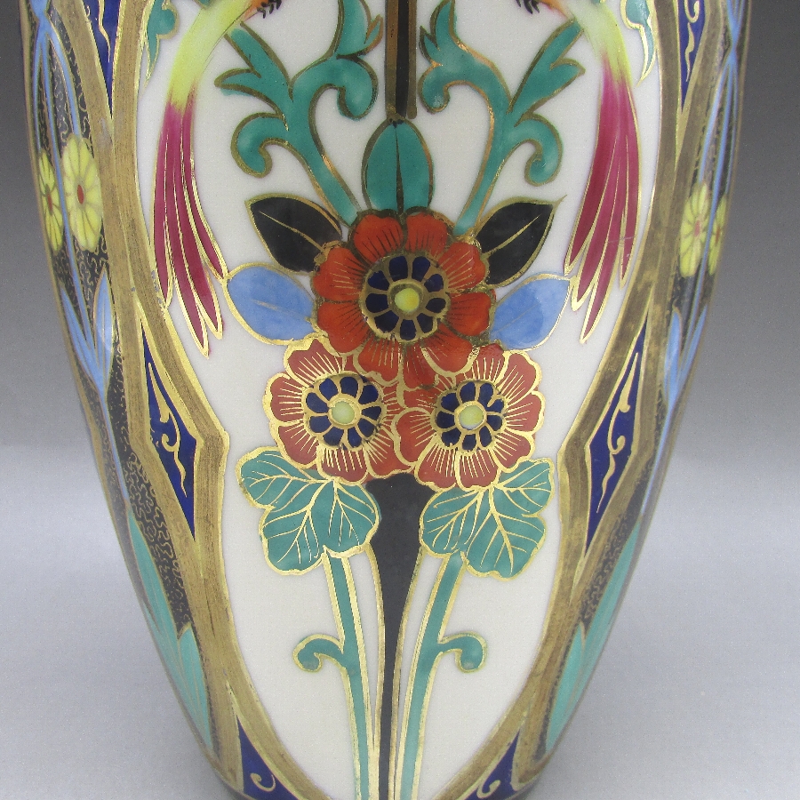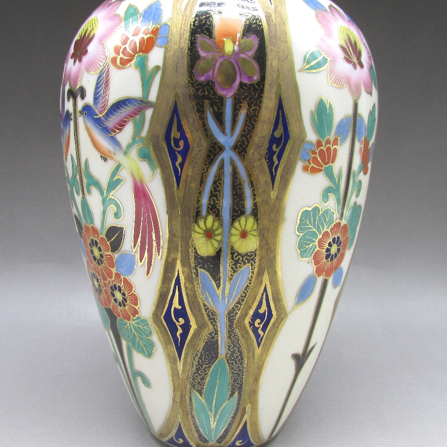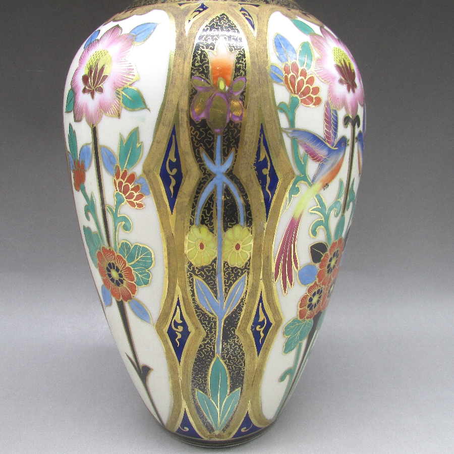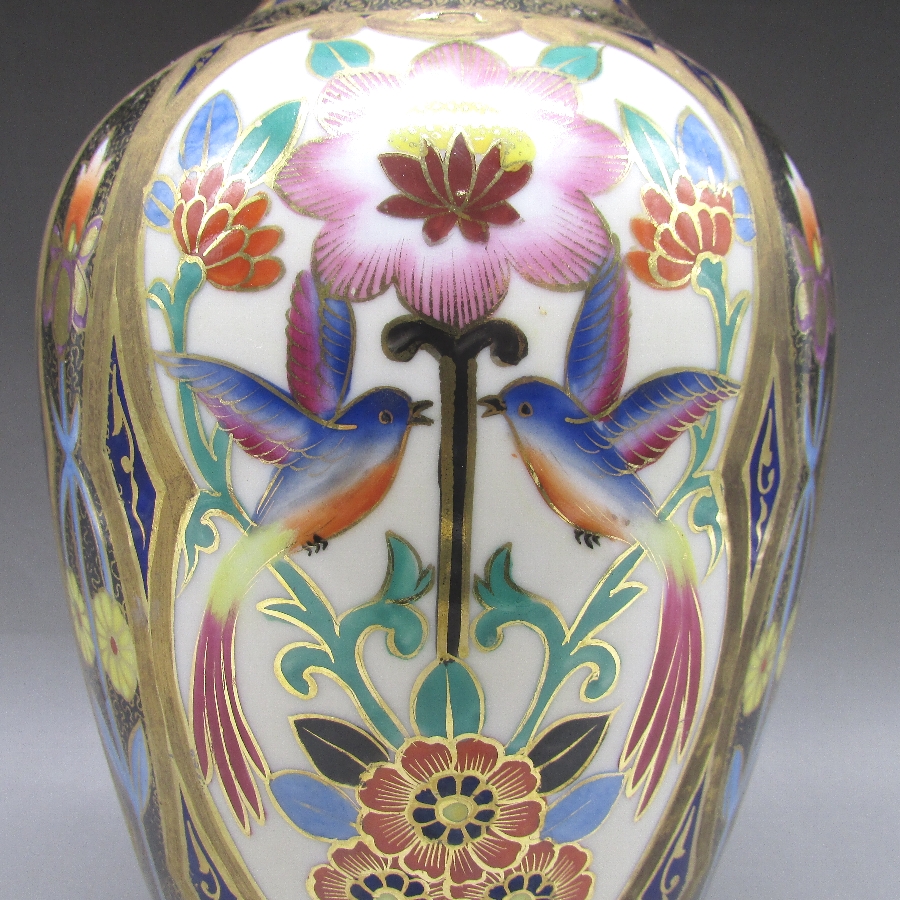 オールドノリタケの花文花瓶です。1906年頃~1925年頃にイギリスに輸出され、約100年の時を経て日本に里帰りしてきました。華やかな花々に鳥を描いた素敵な作品です。
